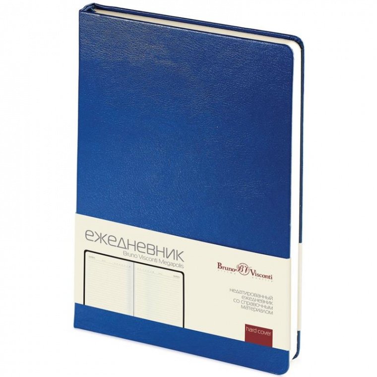 Ежедневник недатированный Bruno Visconti, цвет синий. Коллекция Megapolis. Формата А5, размер изделия — 145×215 мм. Обложка из искусственной кожи на бумажной основе, с закругленными уголками. Долговечный и практичный традиционный для канцелярской продукции переплетный материал с легким рельефом кожи. Тип возможного тиснения — фольгирование и шелкотрафаретная печать. На поверхность возможно горячее тиснение, но само тиснение будет «слепым», подходит тиснение фольгой, особенно белой. Этот аксессуар с твердой обложкой, плотной и приятной на ощупь бумагой подходит для серьезного человека. Блок: недатированный, офсетная бумага бежевого цвета, плотностью 70 г/кв.м., 160 листов (320 страниц), размер блока — 140×210 мм, удобная закладка-ленточка (ляссе) поможет быстро найти нужную страницу. Ежедневник имеет обширный справочный материал из 16 листов (32 страницы) — личные данные, цифровые автомобильные коды,энергетическая и питательная ценность продуктов, расход калорий при физической нагрузке,формат бумаги, размер одежды, греческие буквы, национальные праздники, скорость, страны мира, религиозные праздники, распад алкоголя в крови, десятичные приставки, римские цифры, дни рождения и годовщины. 8 последних листов отрывные с перфорацией.