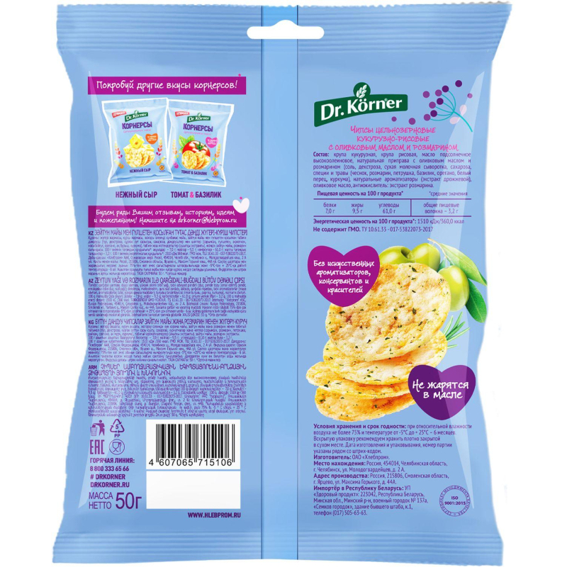 ?Чипсы Dr.Korner цельнозерновые кукурузно-рисовые с? ?оливковым маслом и? ?розмарином, 50? ?г??.? ?Состав: крупа кукурузная, крупа рисовая, масло подсолнечное высокоолеиновое, натуральная приправа с? ?оливковым маслом и? ?розмарином (соль, декстроза, сухая молочная сыворотка, сахароза, специи и? ?травы (чеснок, розмарин, петрушка, базилик, орегано, белый перец, куркума), натуральные ароматизаторы (экстракт дрожжевой)), оливковое масло, антиокислитель: экстракт розмарина??.? ?Пищевая ценность: белки? ?- 7? ?г, жиры? ?- 9.5? ?г, углеводы - 61? ?г??.? ?Энергетическая ценность: 1510? ?кДж??.? ?Условия хранения: при относительной влажности воздуха не? ?более? ?75% и? ?температуре от ??5 °С до + 25 °С?.? ?Вскрытую упаковку рекомендуем хранить плотно закрытой в? ?сухом месте??.? ?Вес: 50? ?г??.?
