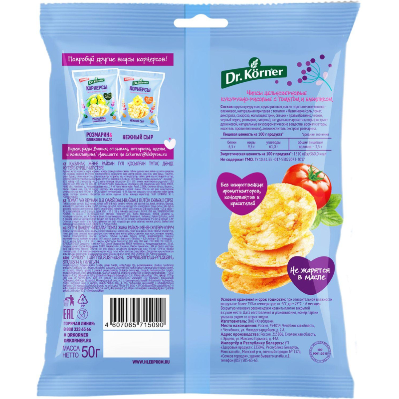 ?Чипсы Dr.Korner цельнозерновые кукурузно-рисовые с? ?томатом и? ?базиликом, 50? ?г??.? ?Состав: крупа кукурузная, крупа рисовая, масло подсолнечное высокоолеиновое, натуральная приправа с? ?томатом и? ?базиликом (соль, томат, декстроза, сахароза, мальтодекстрин, специи и? ?травы (базилик, чеснок, черный перец, розмарин, паприка), натуральные ароматизаторы (экстракт дрожжевой, натуральные вкусоароматические вещества, ароматизаторы, носитель: пропиленгликоль)), антиокислитель: экстракт розмарина??.? ?Пищевая ценность: белки? ?- 6.5? ?г, жиры? ?- 9.5? ?г, углеводы? ?- 61? ?г??.? ?Энергетическая ценность: 1510? ?кДж/360? ?ккал??.? ?Условия хранения: при относительной влажности воздуха не? ?более? ?75% и? ?температуре от ??5 °С до + 25 °С?.? ?Вскрытую упаковку рекомендуем хранить плотно закрытой в? ?сухом месте??.? ?Вес: 50? ?г??.?