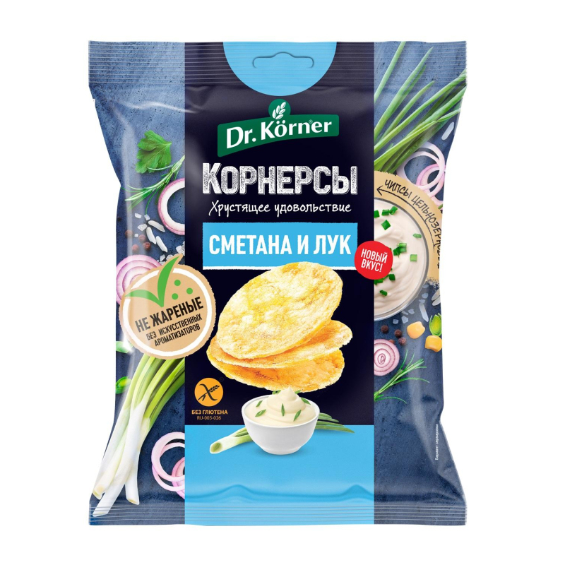 Чипсы Dr.Korner цельнозерновые кукурузно-рисовые со сметаной и луком, 50 г. Состав: крупа кукурузная, крупа рисовая, масло подсолнечное высокоолеиновое, ароматизатор пищевой натуральный ?Сметана с луком? (соль поваренная пищевая, лук, сыворотка молочная сухая, ароматические компоненты, сахар, лук зеленый сушеный, дрожжевой экстракт, петрушка сушеная, лактоза, агент антислеживающий: диоксид кремния аморфный, регулятор кислотности лимонная кислота, сметана сублимационной сушки с массовой долей жира 74%, регулятор кислотности: молочная кислота, куркума), овощи сушеные: лук зеленый порошок, сметана сухая с массовой долей жира 15%, антиокислитель: экстракт розмарина. Пищевая ценность: белки - 8.5 г, жиры - 9 г, углеводы - 69 г. Энергетическая ценность: 1620кДж/390 ккал. Условия хранения: при относительной влажности воздуха не более 75% и температуре от -5°С до + 25°С. Вскрытую упаковку рекомендуем хранить плотно закрытой в сухом месте. Вес: 50 г.