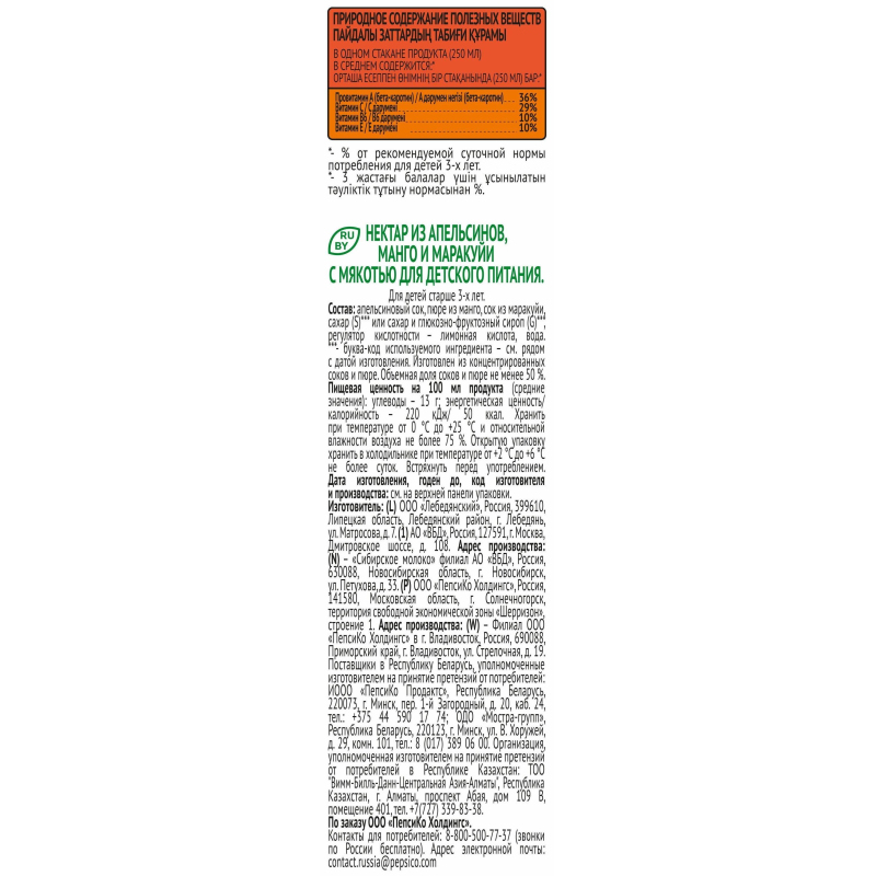 Нектар J7 апельсин, манго, маракуйя с мякотью 0.97 л. Подходит для детского питания. Для детей старше 3-х лет Состав: апельсиновый сок, пюре из манго, сок из маракуйи, сахар (S) или сахар и глюкозно-фруктовый сироп (G), регулятор кислотности - лимонная кислота, вода. Объем: 0.97 л. Вкус: апельсин, манго, маракуйя. Тип упаковки: картонная. Пищевая ценность на 100 мл: углеводы - 13 г. Энергетическая ценность на 100 мл: 220 кДж/50 ккал. Условия хранения: хранить при температуре от 0 до 25 С и относительной влажности воздуха не более 75%. Открытую упаковку хранить в холодильнике при температуре от 2 до 6 С не более суток. Встряхнуть перед употреблением.