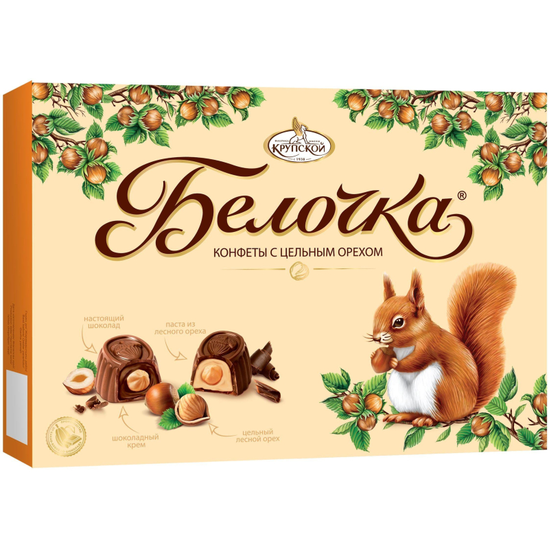 Шоколадные конфеты с нежной кремовой начинкой и цельным орехом. Состав: сахар, какао-тертое, ядра фундука (целые, тертые), эквивалент масла какао (масла растительные, эмульгатор лецитины), жир растительный (масла растительные, эмульгатор лецитин соевый, антиокислитель концентрат смеси токоферолов), какао-порошок, сыворотка молочная сухая, молоко сухое обезжиренное, эмульгаторы (лецитин соевый, эфиры полиглицерина и взаимоэтерифицированных рициноловых кислот), мальтодекстрин, ароматизатор, соль. Вес: 160 г. Пищевая ценность: жиры - 29.3 г, белки - 5.3 г, углеводы - 52.1 г. Энергетическая ценность: 524 ккал. Срок годности: 8 месяцев. Условия хранения: хранить при температуре от 15 до 21 С и относительной влажности воздуха не более 75%. Производитель: Славянка. Страна производства: Россия.