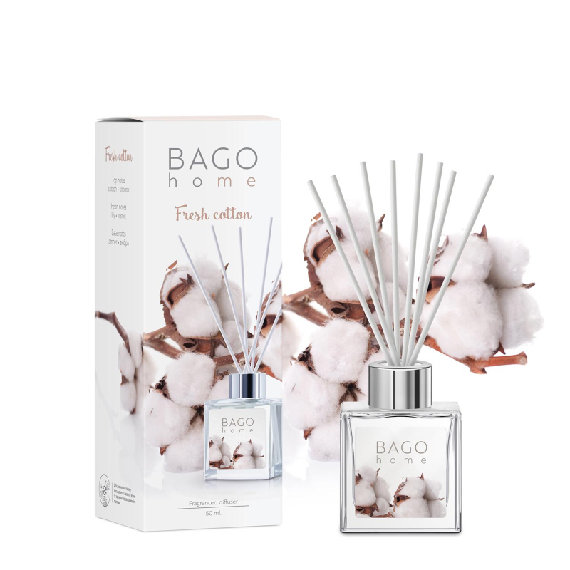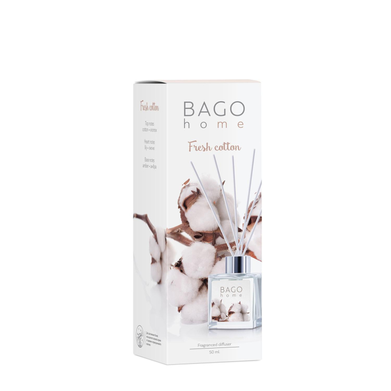 Ароматический диффузор Свежий хлопок 50 мл. Время работы: 4-6 недель. Площадь ароматизации: 5-15 м?. В комплекте 6 фибровых палочек из прессованного волокна.