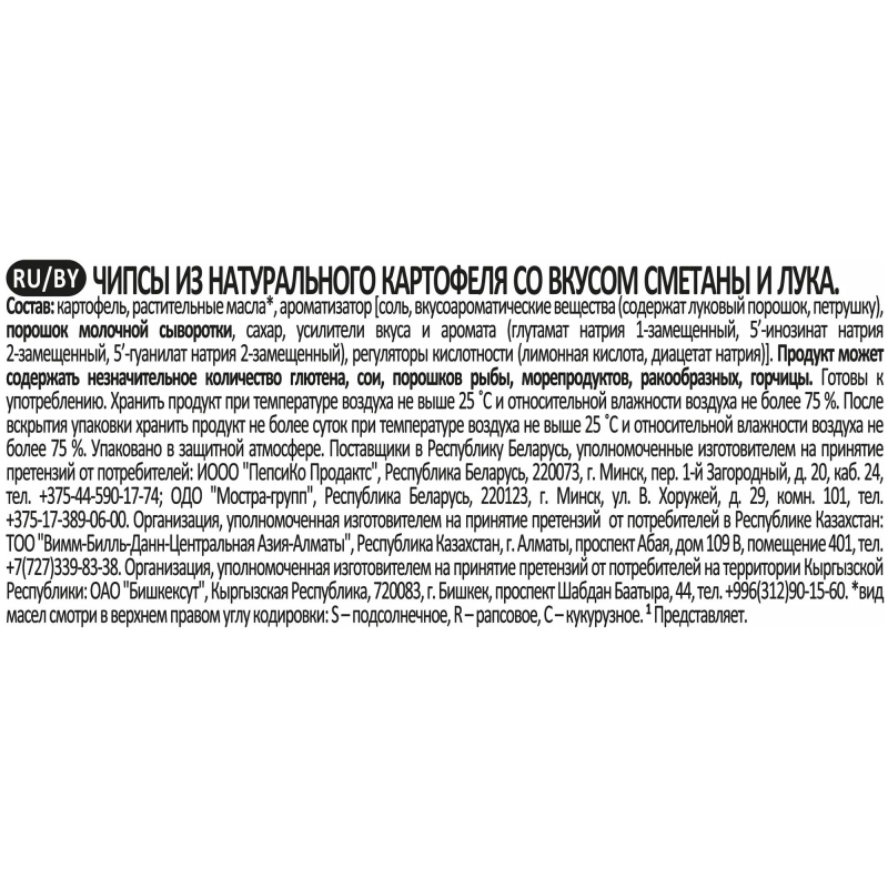 Lays - чипсы, каждая пачка которых изготовлена из специально отобранного картофеля и соответствует самым высоким стандартам качества. Хрустящие и легкие на вкус картофельные чипсы Lays были созданы, чтобы вызвать улыбку на лице каждого человека, поэтому ими так приятно делиться с лучшими друзьями. Чипсы Lays, несомненно, скрасят ваш день. Вкус свежей деревенской сметаны и аромат молодого зеленого лука - отличные спутники для хрустящей картошки. Попробовав однажды эти рифленые чипсы, вы никогда не сможете забыть их нежно-сливочный вкус. Идеальный формат для большой компании. Состав: картофель, растительное масло, ароматизатор (соль, вкусоароматические вещества (луковый порошок, листья петрушки, чесночный порошок, сырный порошок, сметанный порошок), сухая молочная сыворотка, сахароза, усилитель вкуса и аромата (глутамат натрия 1-замещенный)). Пищевая ценность: белки - 6 г; жиры - 30 г; углеводы - 53 г. Энергетическая ценность: 510 ккал. Условия хранения: хранить продукт при температуре воздуха не выше 20 ?С и относительной влажности воздуха не более 75 %. После вскрытия упаковки хранить продукт не более суток при температуре воздуха не выше 25 ?С и относительной влажности воздуха не более 75 %. Вес: 225 г.