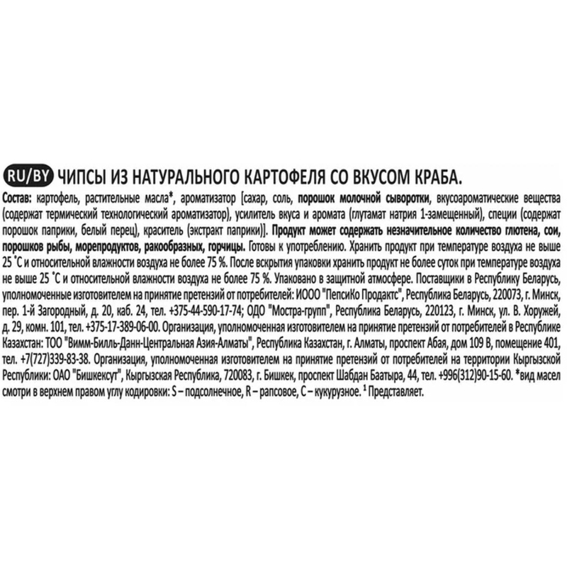 Lays - чипсы, каждая пачка которых изготовлена из специально отобранного картофеля и соответствует самым высоким стандартам качества. Хрустящие и легкие на вкус картофельные чипсы Lays были созданы, чтобы вызвать улыбку на лице каждого человека, поэтому ими так приятно делиться с лучшими друзьями. Чипсы Lays, несомненно, скрасят ваш день. Специально для ценителей мы приготовили хрустящие чипсы Lays со вкусом нежного камчатского краба. Отличное сочетание вкуса краба и золотистых картофельных чипсов подарят вихрь удовольствия! Состав: картофель, растительные масла, ароматизатор (сахар, соль, порошок молочной сыворотки, вкусоароматические вещества (содержат термический технологический ароматизатор), усилитель вкуса и аромата (глутамат натрия 1-замещенный), специи (содержат белый перец), краситель (экстракт паприки)). Пищевая ценность: белки - 6 г; жиры - 32 г; углеводы - 53 г. Энергетическая ценность: 520 ккал. Условия хранения: хранить продукт при температуре воздуха не выше 25 ?С и относительной влажности воздуха не более 75 %. После вскрытия упаковки хранить продукт не более суток при температуре воздуха не выше 25 ?С и относительной влажности воздуха не более 75 %. Вес: 225 г.
