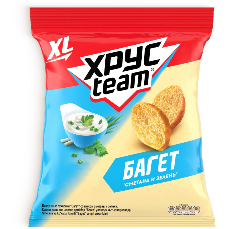 Хрустим багет со вкусом сметаны и зелени. На создание этих сухариков компанию вдохновил восхитительный французский багет в сочетании с изысканными вкусами. Когда хочешь сделать перерыв, открывай Хрустим. Воздушные и хрустящие. Тают во рту. Деликатный вкус оставляет приятное послевкусие. Состав: мука пшеничная, крупа манная, масло рапсовое, ароматизатор (cоль, порошок молочной сыворотки, вкусоароматические вещества (содержат луковый порошок и молочные производные), усилители вкуса и аромата (глутамат натрия 1-замещенный, 5-инозинат натрия 2-замещенный, 5-гуанилат натрия 2-замещенный), петрушка, регулятор кислотности (диацетат натрия)), сахар, агент антислеживающий (карбонат кальция), карамелизованный сахар, экстракт моркови. Пищевая ценность: белки - 10 г; жиры - 15 г; углеводы - 65 г. Энергетическая ценность: 440 ккал. Условия хранения: хранить продукт при температуре воздуха не выше 25 ?С и относительной влажности воздуха не более 75 %. После вскрытия упаковки хранить продукт не более суток при температуре воздуха не выше 25 ?С и относительной влажности воздуха не более 75 %. Вес: 100 г.