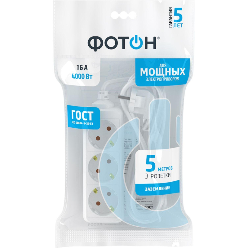 Удлинитель сетевой ФОТОН 16-53Е, 5м, 3 розетки, 16А, с заземл, Белый