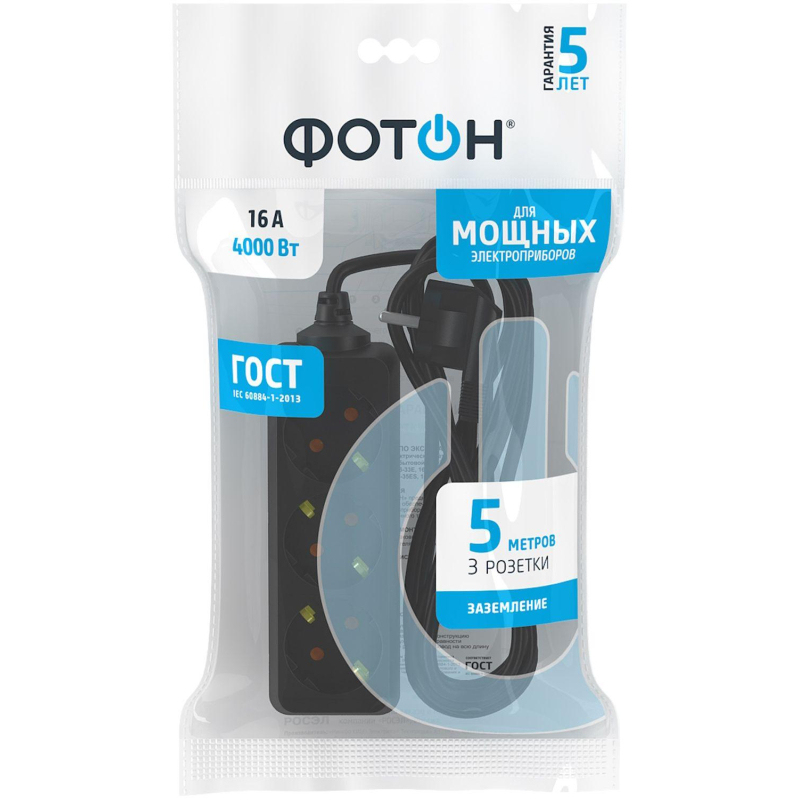 Удлинитель сетевой ФОТОН 16-53Е, 5м, 3 розетки, 16А, с заземл.,Черный