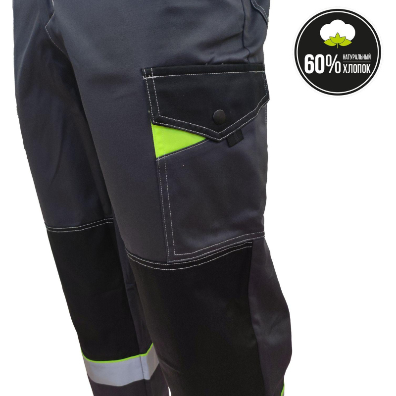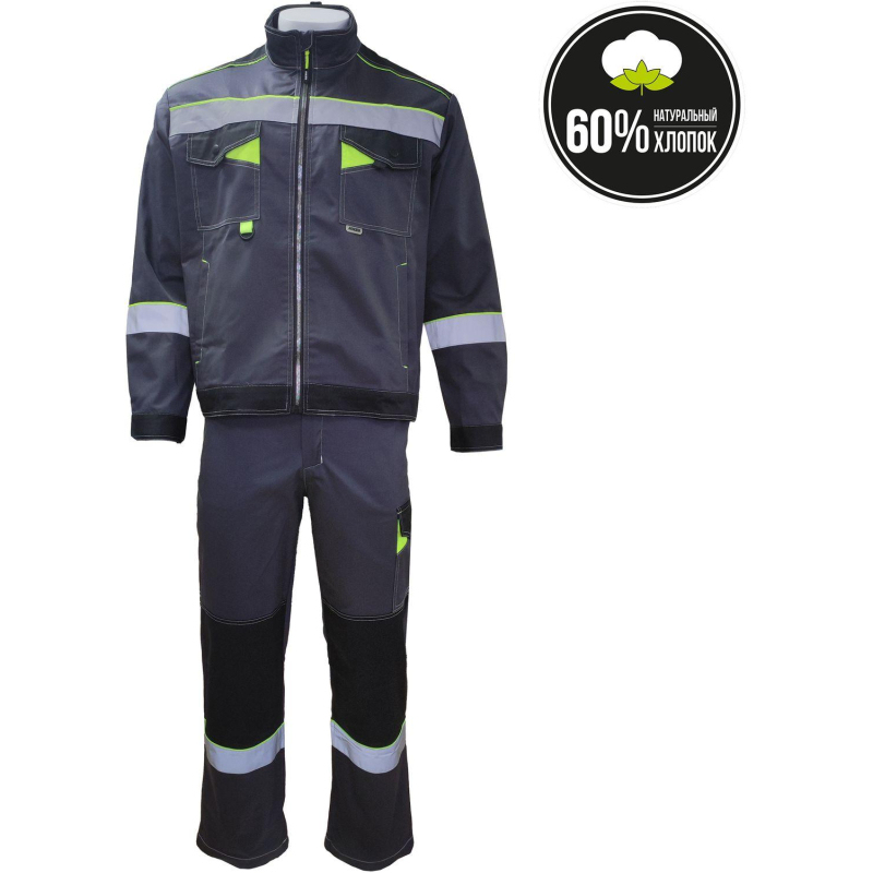 Костюм рабочий летний мужской Корвет Коттон с СОП, состоит из куртки и полукомбинезона. Цвет: темно-серый/черный. Размер 44-46, рост 182-188 см. Ткань: ?Орион? смесовая с водоотталкивающей отделкой. Состав ткани: 60% хлопок, 40% полиэстер. Плотность ткани: 235 г/кв.м. Костюм с контрастной отсрочкой, с застежкой на закрытую молнию. Молния пластиковая, повышенной прочности, с металлическим бегунком, ?мелкий зуб?, цвет ?серебро?. Нагрудные карманы с накладными комбинированными и фигурными клапанами на кнопках с пластиковой шляпкой. Нижние карманы в рельефных швах полочек. Рукава с локтевым швом и манжетами на кнопках. Полукомбинезон с 7-ю функциональными карманами. Бретели с фастексами (застежками) полуповорот, обеспечивающие функциональность при удержании бретели. Застежка гульфика на молнию, в боковом шве на пуговицы. Объемные накладки темного цвета, с вытачками в области колена. В костюме присутствуют элементы повышенной видимости - световозвращающая лента шириной 50 мм (400 кд) и декоративные элементы лимонного цвета. Сферы применения: строительство, ЖКХ, сервисные службы. Соответствует стандартам: ТР ТС 019/2011, ГОСТ 12.4.280-2014.