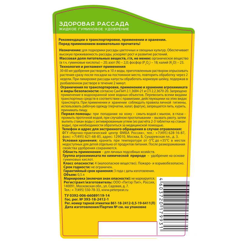 Удобрение жидкое гуминовое Живая сила, Здоровая рассада, 0,5л, Г-04-0.5