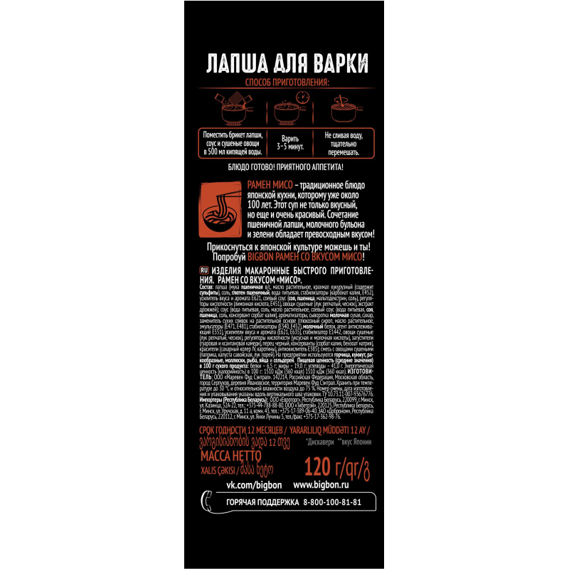 Лапша Биг Бон Рамен со вкусом мисо, 120 г. Состав: лапша (мука пшеничная в/с, масло растительное, крахмал кукурузный (содержит сульфиты), соль, глютен пшеничный, вода питьевая, стабилизаторы (карбонат калия, Е452), усилитель вкуса и аромата Е621, соевый соус (соя, пшеница, мальтодекстрин, соль), регуляторы кислотности (лимонная кислота, Е451), овощи сушеные (лук репчатый, чеснок), экстракт дрожжей); соус (вода питьевая, соль, масло соевое, усилители вкуса и аромата (Е621, Е635), соевый соус (соя, пшеница, мальтодекстрин, консервант сорбат калия, вода питьевая), ароматизаторы (содержат рыбу), сыворотка молочная сухая, сахар, заменитель сухих сливок на растительной основе (глюкозный сироп, масло растительное, эмульгаторы (Е471, Е481), стабилизаторы (Е340, Е452), молочный белок, агент антислеживающий Е551), овощи сушеные (лук репчатый, чеснок), регуляторы кислотности (уксусная и молочная кислоты), красители (сахарный колер IV, каротины), крахмал кукурузный, стабилизатор гуаровая камедь, перец черный, консерванты (сорбат калия, бензоат натрия), антиокислитель Е385); овощи сушеные (капуста савойская, лук зеленый, паприка). Продукт может содержать следы горчицы, сельдерея и яиц. Пищевая ценность: белки - 7 г, жиры - 19 г, углеводы - 41 г. Энергетическая ценность: 360 ккал. Срок годности: 12 месяцев. Условия хранения: хранить при температуре не выше 30 С и относительной влажности воздуха не более 75%. Вес: 120 г. Страна производства: Россия.