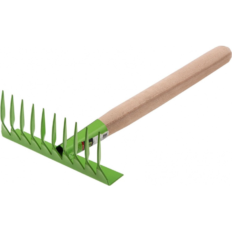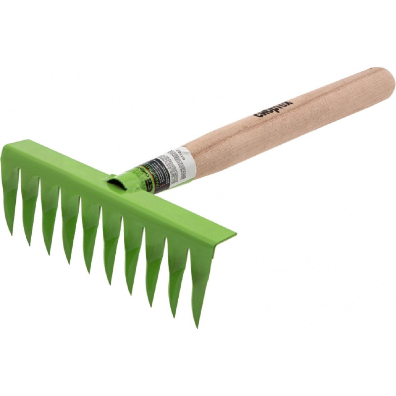 Грабли прямые с витыми зубьями Сибртех сталь 20 см (черенок 31.4 см)Грабли витые 10-зубые Сибртех АГРОНОМ 61762, 200 х 390 мм, стальные, с деревянной рукояткой, служат для садовых работ на небольших участках земли. Они используются для рыхления грунта, подходят также для уборки мусора с грядок и клумб. Инструмент полностью готов к эксплуатации, так как поставляется в сборе с деревянной рукояткой.Преимущества: утолщенные витые зубья с заостренными концами эффективно разбивают земляные комья, обеспечивая качественную аэрацию почвы. Рабочая часть с тулейкой выполнены из конструкционной углеродистой стали, поэтому грабли устойчивы к износу. Грабли отличаются хорошей сопротивляемостью нагрузкам и рассчитаны на долгую эксплуатацию. Покрытие из порошковой эмали защищает от коррозии, а значит, грабли прослужат долго. В верхней части рукоятки предусмотрено отверстие для подвесного хранения.Ширина рабочей части - 20 см.Длина рабочей части - 8 см.Вес: 440 г