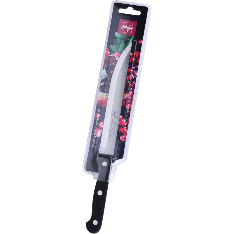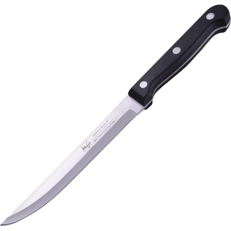 ?Нож кухонный Mielaje (92080) 15? ?см нержавеющая сталь. Ножи Mielaje изготовлены из? ?высоколегированной углеродистой стали. Сталь упрочняется термообработкой и? ?обладает высокой износостойкостью, ударной вязкостью, жароустойчивостью. Ножи отличаются высокой прочностью, превосходными характеристиками, удобной рукояткой из? ?полипропилена. ??Рекомендации по? ?уходу за? ?ножами??:? ?- Перед первым использованием сполосните нож горячей водой??.? ?- Храните ножи отдельно от? ?остальной посуды. Самый лучший способ хранения ножей? ?- с? ?помощью магнитного держателя или специальной подставки для ножей??.? ?- Никогда не? ?замачивайте ножи с? ?грязной посудой, потому что под воздействием щелочей (от? ?моющих средств), пищевых кислот и? ?воды, сталь коррозирует??.? ?- Не? ?рекомендуется мыть ножи в? ?посудомоечной машине??.? ?- Кухонный нож должен только резать, для каждой работы выбирайте подходящий по? ?размеру нож. Не? ?стоит ножом открывать консервные банки, использовать вместо отвертки или молотка??.? ?- Не разрубайте ножом кости, воспользуйтесь лучше специальным топориком??.?