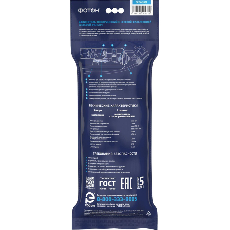 Сетевой фильтр Фотон SP 10-35ES на 5 розеток 3 метра (25378) Внешний вид и/или характеристики товара могут быть изменены производителем в соответствии с производственным процессом.