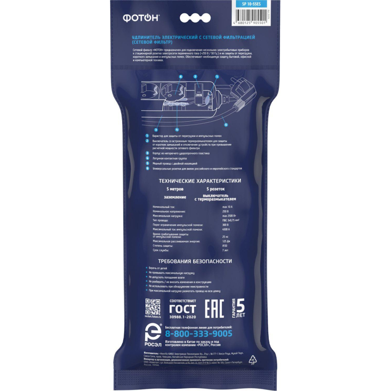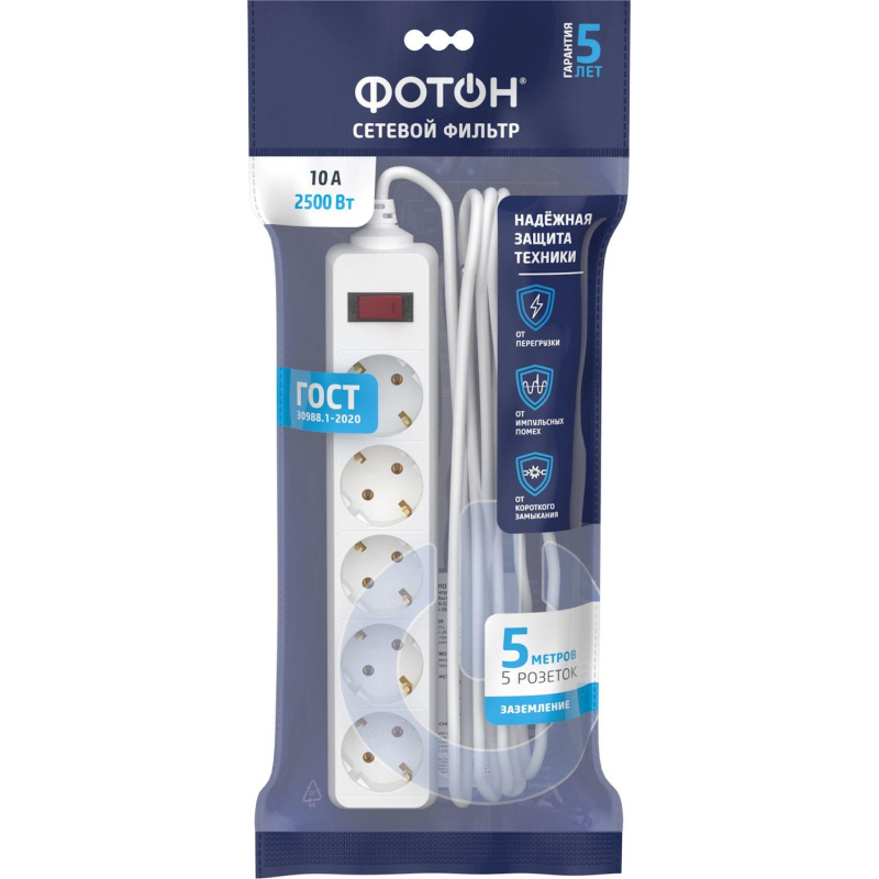 Сетевой фильтр Фотон SP 10-55ES на 5 розеток 5 метров (25376) Внешний вид и/или характеристики товара могут быть изменены производителем в соответствии с производственным процессом.