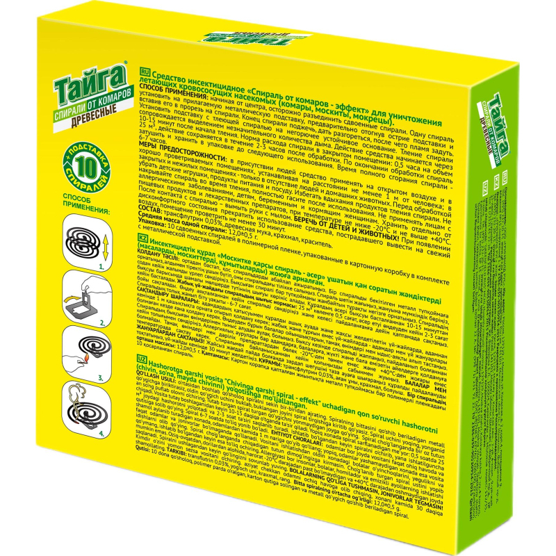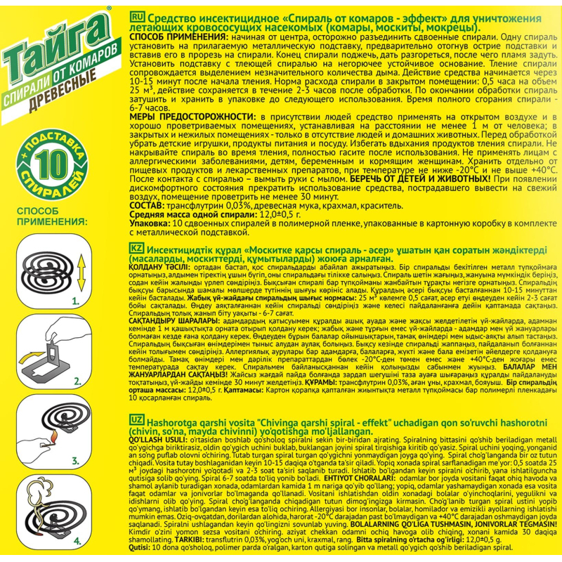 Средство от насекомых Тайга от комаров спираль 120 г (10 штук в упаковке)Назначение. Средство инсектицидное 'Спираль от комаров - эффект' для уничтожения летающих кровососущих насекомых (комары, москиты, мокрецы).Способ применения. Начиная от центра, осторожно разъединить сдвоенные спирали. Одну спираль установить на прилагаемую металлическую подставку, предварительно отогнув острие подставки и вставив его в прорезь на спирали. Конец спирали поджечь, дать разгореться, после чего пламя задуть. Установить подставку с тлеющей спиралью на негорючее устойчивое основание. Тление спирали сопровождается выделением незначительного количества дыма. Действие средства начинается через 10-15 минут после начала тления. Норма расхода спирали в закрытом помещении: 0.5 часа на объем 25 м?, действие сохраняется в течение 2-3 часов после обработки. По окончании обработки спираль затушить и хранить в упаковке до следующего использования. Время полного сгорания спирали - 6-7 часов.Меры предосторожности. В присутствии людей средство применять на открытом воздухе и в хорошо проветриваемых помещениях, устанавливая на расстоянии не менее 1 м от человека; в закрытых и нежилых помещениях - только в отсутствие людей и домашних животных. Перед обработкой убрать детские игрушки, продукты питания и посуду. Избегать вдыхания продуктов тления спирали. Не накрывайте спираль во время тления, полностью гасите после использования. Не применять лицам с аллергическими заболеваниями, детям, беременным и кормящим женщинам. После контакта с спиралью - вымыть руки с мылом. Беречь от детей и животных.При появлении дискомфортного состояния прекратить использование средства, пострадавшего вывести на свежий воздух, помещение проветрить не менее 30 минут.Состав. Трансфлутрин 0.03%, древесная мука, крахмал, краситель.Условия хранения. Хранить отдельно от пищевых продуктов и лекарственных препаратов, при температуре не ниже -20°С и не выше +40°С.Срок годности. 4 года. Относится к сегменту 'суперэконом' - товар с минимальными требованиями к качеству для тех, кто хочет сэкономить. Товар отвечает основным потребительским характеристикам.