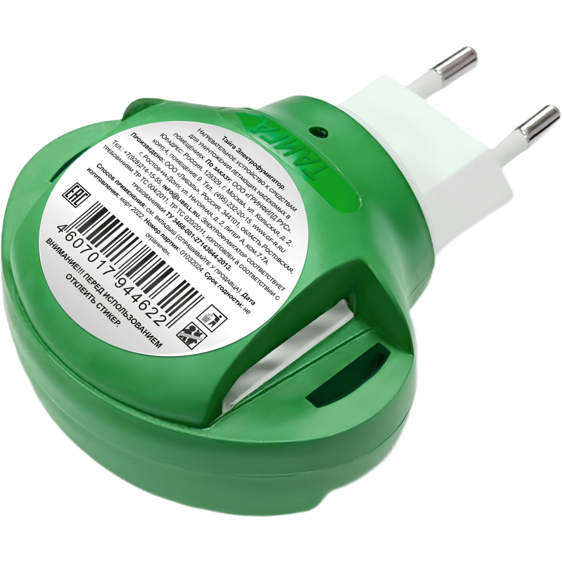 Средство от насекомых Тайга электрофумигаторНазначение. Для испарения жидкостного инсектицидного средства из флакона или подогрева пластин, пропитанных инсектицидным средством, для уничтожения комаров в помещении.Способ применения. Используя жидкость: включайте прибор в электросеть, повернув вилку так, чтобы флакон находился в вертикальном положении дном вниз. Используя пластину: включите прибор в электросеть, повернув вилку так, чтобы пластина располагалась горизонтально. Используйте в электросети 220 Вт, 50 Гц. Не применяйте одновременно флакон с жидкостью и пластину.Меры предосторожности. Устанавливайте электрофумигатор в местах, недоступных детям и животным, на расстоянии не менее 1 метра от человека, в проветриваемых помещениях. Не оставляйте без присмотра. Не касайтесь включенного прибора влажными руками или металлическими предметами. Не мочить водой.Условия хранения. Хранить вдали от влаги и прямых солнечных лучей, при температуре от -5° до +50° С, на расстоянии не менее 1 метра от отопительных приборов.Срок годности. Не ограничен. Относится к сегменту 'суперэконом' - товар с минимальными требованиями к качеству для тех, кто хочет сэкономить. Товар отвечает основным потребительским характеристикам.