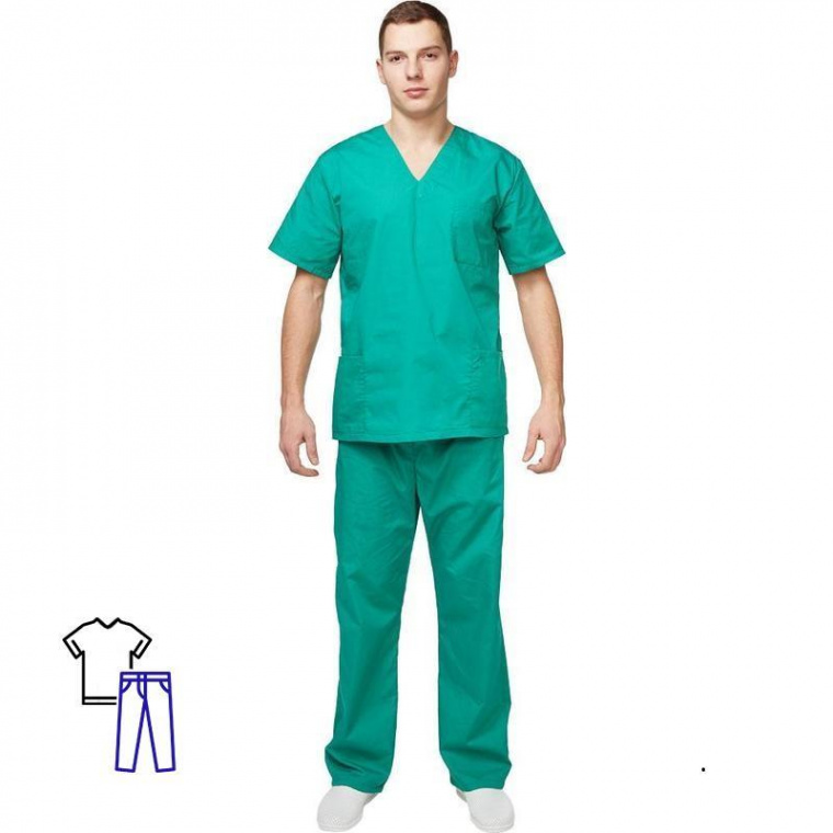 Костюм хирурга универсальный м05-КБР зеленый (размер 44-46, рост 158-164) изготовлен из ткани зеленого цвета, состав — 65% полиэфира и 35% хлопка. Плотность материала составляет 120 г/кв. м, благодаря чему обеспечивается легкость изделия. Ти-Си — материал, приятный на ощупь, гигиеничен и долговечен. Не мнется, легко и быстро стирается, быстро сохнет. Долго сохраняет свой первоначальный яркий цвет. Ткань «дышит», благодаря входящему в состав хлопку, имеет повышенный срок службы и проста в уходе, благодаря полиэфиру. Медицинский костюм состоит из куртки и брюк, подходит и для женщин, и для мужчин. Куртка с коротким рукавом и нагрудным карманом, свободный покрой обеспечивает удобство в работе. Брюки прямые на резинке. Униформа рекомендована для сферы красоты и здоровья: медицинские учреждения, центры. Соответствует ГОСТ 9897-88