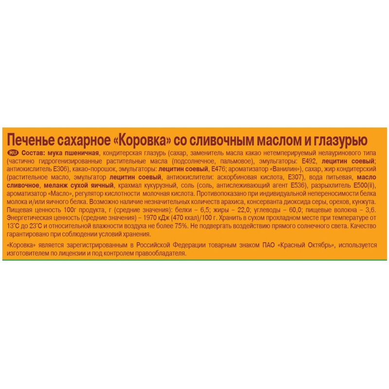 Хрустящие печенья ?Коровка? - полноценный десерт к чаю или кофе. Рассыпчатые сахарные печенья с насыщенным сливочным вкусом и тонким ароматом сливочного масла. Донышко печенья покрыто шоколадной глазурью, тающей на языке нежной пряностью какао. Печенья хороши и как самостоятельное лакомство и в качестве дополнения к молоку. Состав: мука пшеничная, кондитерская глазурь (сахар, заменитель масла какао нетемперируемый нелауринового типа (частично гидрогенизированные растительные масла (подсолнечное пальмовое), эмульгаторы: Е492, лецитин соевый; антиокислитель Е306), какао-порошок, эмульгаторы: лецитин соевый, Е476; ароматизатор ?Ванилин?), сахар, жир кондитерский (растительное масло, эмульгатор лецитин соевый, антиокислители: аскорбиновая кислота, Е307), вода питьевая, масло сливочное, меланж сухой яичный, крахмал кукурузный, соль (соль, антислеживающий агент Е536), разрыхлитель Е500(i), ароматизатор ?Масло?, регулятор кислотности молочная кислота. Противопоказано при индивидуальной непереносимости белка молока и /или яичного белка. Возможно наличие незначительных количеств арахиса, консерванта диоксида серы, орехов, кунжута. Пищевая ценность 100 г продукта, г (средние значения): белки - 6,5; жиры - 22,0; углеводы - 60,0; пищевые волокна - 3,6. Энергетическая ценность 100 г продукта (средние значения): 1970 кДж (470 ккал). Условия хранения: хранить в сухом прохладном месте при температуре от 13°С до 23°С и относительной влажности воздуха не более 75%. Не подвергать воздействию прямого солнечного света. Срок годности: 12 месяцев. Масса нетто: 115 г. Тип упаковки: мягкая. Страна производства: Россия.