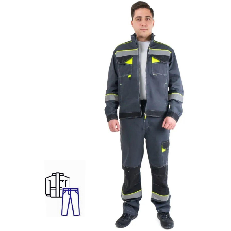Костюм рабочий летний мужской Корвет Коттон с СОП, состоит из куртки и брюк. Цвет: темно-серый/черный. Размер 60-62, рост 182-188 см. Ткань: ?Орион? смесовая с водоотталкивающей отделкой. Состав ткани: 60% хлопок, 40% полиэстер. Плотность ткани: 235 г/кв.м. Костюм с контрастной отсрочкой, с застежкой на закрытую молнию. Молния пластиковая, повышенной прочности, с металлическим бегунком, ?мелкий зуб?, цвет ?серебро?. Нагрудные карманы с накладными комбинированными и фигурными клапанами на кнопках с пластиковой шляпкой. Нижние карманы в рельефных швах полочек. Рукава с локтевым швом и манжетами на кнопках. Застежка гульфика на молнию, в боковом шве на пуговицы. Объемные накладки темного цвета, с вытачками в области колена. В костюме присутствуют элементы повышенной видимости - световозвращающая лента шириной 50 мм (400 кд) и декоративные элементы лимонного цвета. Сферы применения: строительство, ЖКХ, сервисные службы. Соответствует стандартам: ТР ТС 019/2011, ГОСТ 12.4.280-2014.