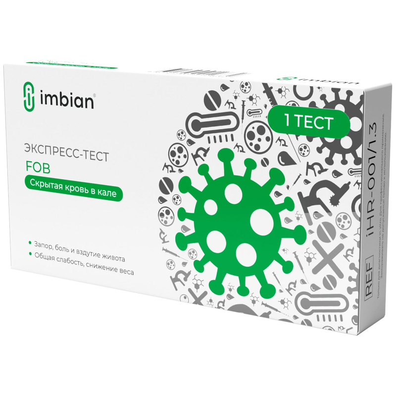 Экспресс-тест иммунохроматографический для качественного определения in vitro скрытой крови (гемоглобина) в кале 'FOB-ИМБИАН-ИХА'. Комплектация: Тест-полоска - 1 шт; Пробирка-капельница с БР (2 мл) - 1 шт; Пипетка медицинская полимерная для переноса жидкостей (Пастера), 0,25 мл - 1 шт; Микропробирка - 1 шт; Инструкция - 1 шт.
