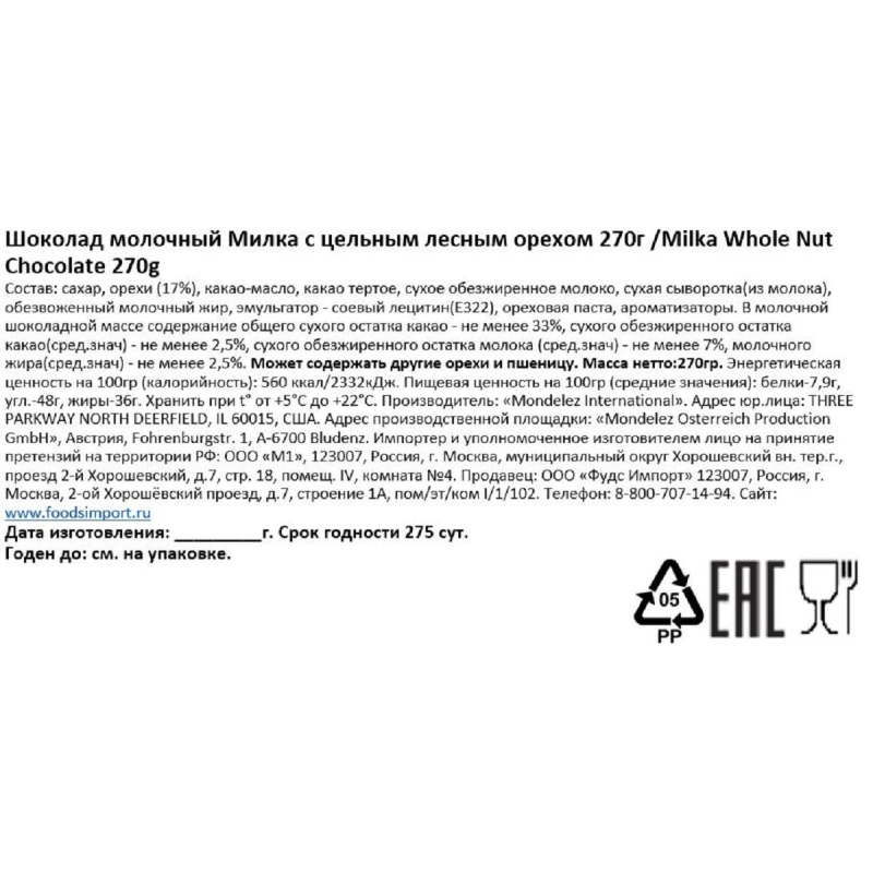 ?Нежный молочный шоколад из? ?настоящего альпийского молока с? ?цельным фундуком в? ?большом формате. Это истинное наслаждение для сладкоежек! Обольстительный аромат пленяет с? ?первой секунды после открытия упаковки. Отличная идея для сладкого комплимента.? ?Состав: сахар, орехи (17%),? ?какао-масл??о??, какао тертое, сухое обезжиренное молоко, сухая сыворотка (из? ?молока), обезвоженный молочный жир, эмульгатор? ?- соевый лецитин (Е322), ореховая паста, ароматизаторы. В? ?молочной шоколадной массе содержание общего сухого остатка какао? ?- не? ?менее 33%, сухого обезжиренного остатка какао (средние значения)? ?- не? ?менее 2,5%, сухого обезжиренного остатка молока (средние значения)? ?- не? ?менее 7%, молочного жира (средние значения)? ?- не? ?менее 2,5%. Может содержать другие орехи и? ?пшеницу??.? ?Масса нетто: 270 г??.? ?Энергетическая ценность на? ?100 г? ?(калорийность): 560 ккал/2332 кДж??.? ?Пищевая ценность на? ?100 г? ?(средние значения):? ?белки?? ??-?? ??7??,9 г,? ?углеводы?? ??-?? ??4??8? ?г,? ?жиры?? ??-?? ??3??6? ?г??.? ?Условия хранения: хранить при температуре от? ?+5? ?до? ?22 °С??.? ?Общий срок годности: 9? ?месяцев??.? ?Страна производства: Австрия??.?