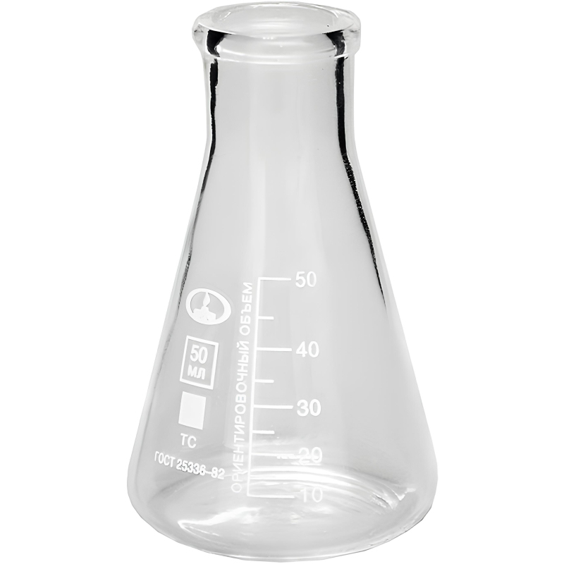 Колба коническая (Эрленмейера) разработана для фильтрования, выпаривания, перегонки, разгонки, дистилляции и синтеза в лабораторных условиях. Производится с ориентировочной шкалой белого цвета. Изготовлена из стекла ТС по ГОСТ 21400-75. Изготовлена по ТУ 9464-019-29508133-2015 в соответствии с техническими требованиями ГОСТ 25336-82.b Тип Кн, исполнение 2. Вместимость - 50 мл. Цена деления - 5 мл. Диаметр горловины - 22+1,5 мм. Диаметр колбы - 51+1,0 мм. Высота - 85+3,0 мм.