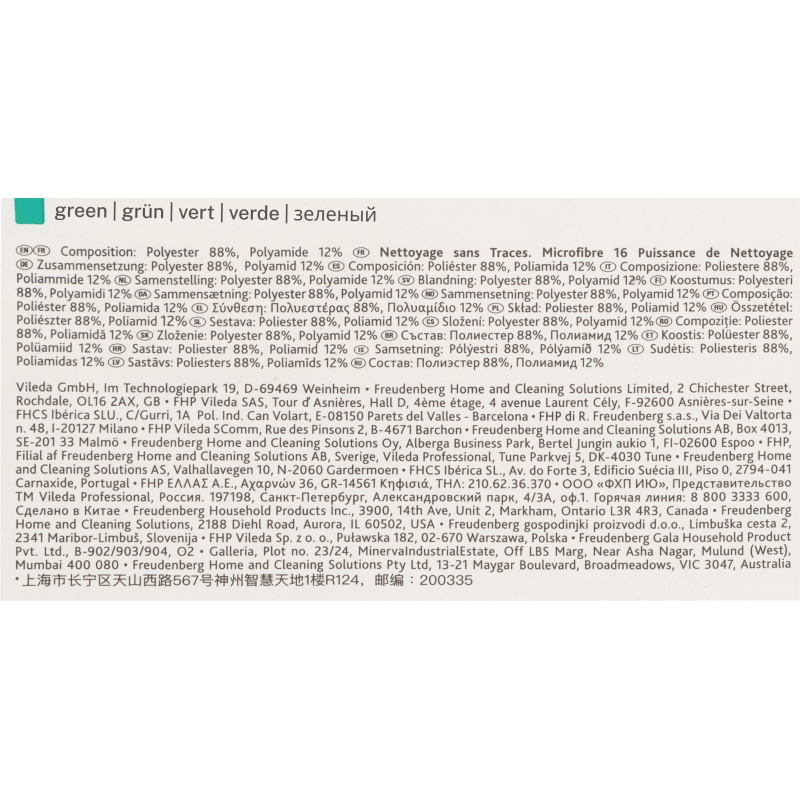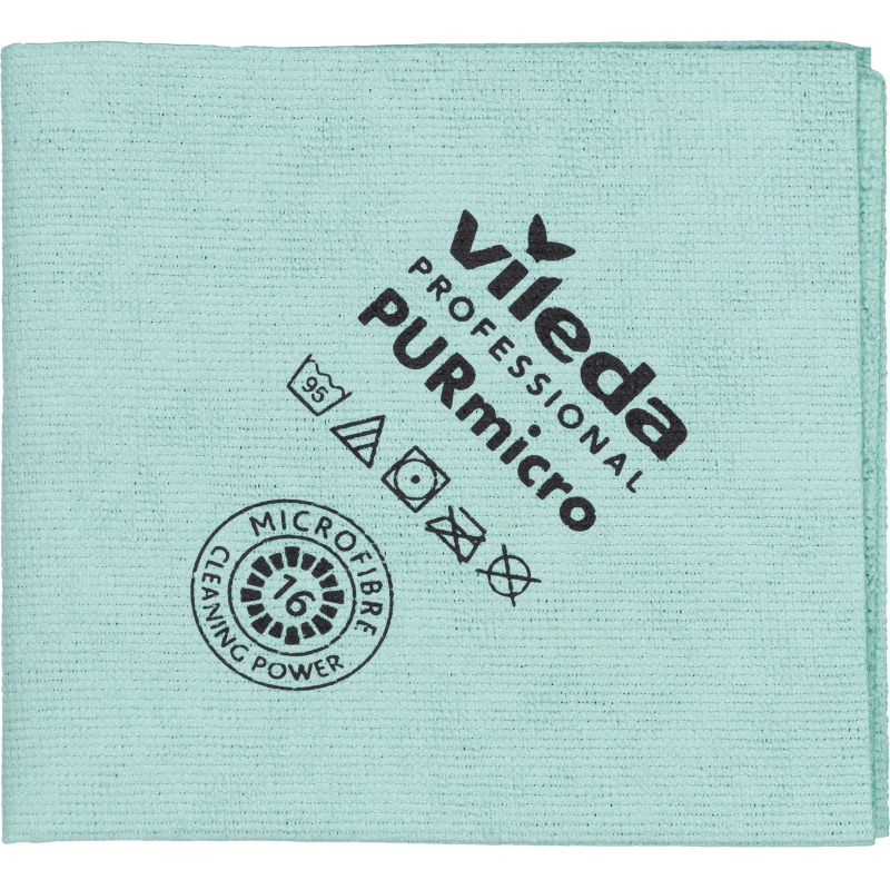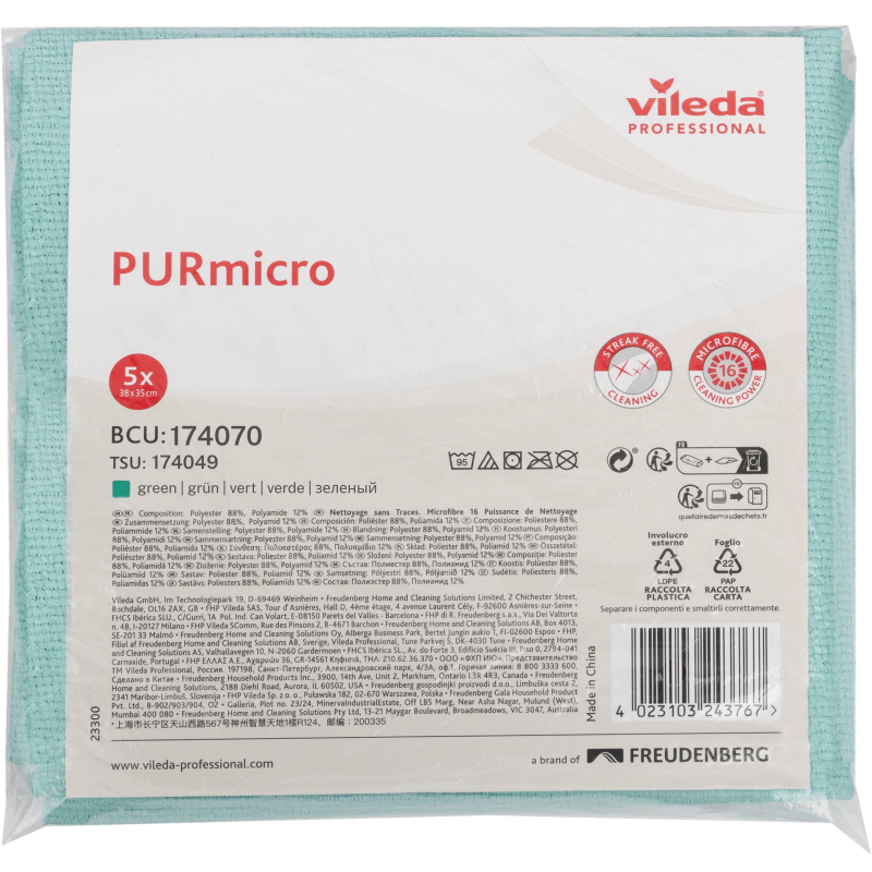Салфетки хозяйственные Vileda Professional ПУРМикро микрофибра 38x35 см 260 г/кв.м зеленые (5 штук в упаковке).За счет специального ПУР покрытия и микроволокна салфетка эффективно собирает загрязнения и влагу всего за одно движение. После протирки поверхность высыхает за несколько секунд и не требует дополнительного прохода. Ультратонкое микроволокно разделено на 16 сегментов для глубокого проникновения в поры поверхности и эффективной очистки. Убирает до 99.99% бактерий с поверхности без использования дезинфектанта. Универсальное применение. Повышенная впитываемость. Не оставляет ворса. Отлично выполаскивается от таких мелких частиц, как песок, крошки, земля, пыль, что позволяет исключить царапины на деликатных поверхностях. Мягкая и приятная на ощупь в сухом и влажном состоянии. Возможность использования с кислотными моющими средствами для уборки санитарных зон в рабочей концентрации. Долгий срок службы. Подходит для работы с пищевыми предприятиями, подтверждено экспертным заключением в РФ. Подходит для термохимической дезинфекции.