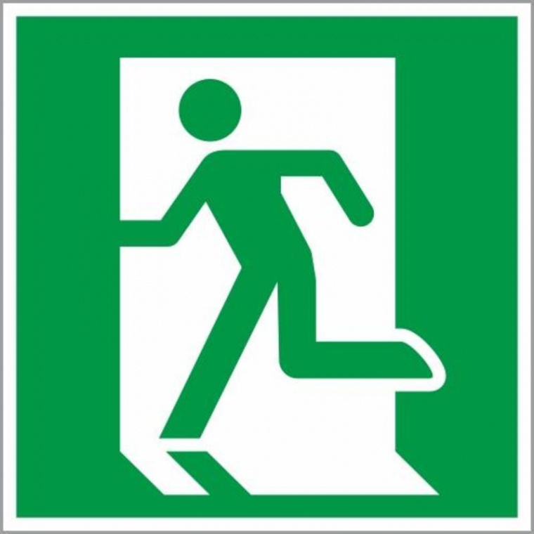 Эвакуационный знак безопасности (наклейка) «Выход здесь (левосторонний)», рекомендованный к размещению на дверях (над дверями) эвакуационных выходов, которые открываются c левой стороны, а также на стенах помещений совместно с направляющей стрелкой, указывающей направление к эвакуационному выходу.