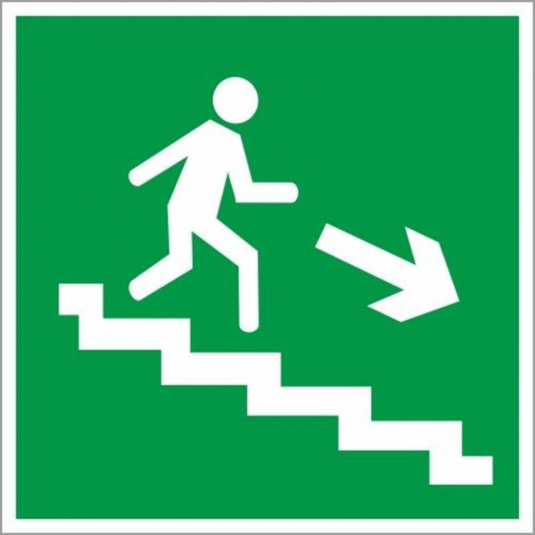 Эвакуационный знак безопасности (наклейка) «Направление к эвакуационному выходу по лестнице вниз (правосторонний)», предназначенный для установки на стенах, прилегающих к лестничному пролету, а также на лестничных площадках.