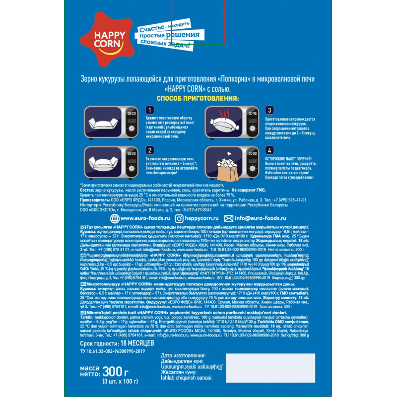 Зерно кукурузы лопающейся для приготовления 'Попкорна' в микроволновой печи 'Happy Corn' с солью. Состав: зерно кукурузы, масло растительное пальмовое, соль, краситель каротины. Не содержит ГМО. Пищевая ценность на 100 г продукта (средние значения): белки - 6,5 г, жиры - 17 г, углеводы - 57 г. Энергетическая ценность (калорийность): 1710 кДж (410 ккал). Хранить при температуре не выше 25 С и относительной влажности воздуха не более 75 %. Срок годности: 18 месяцев. Вес: 300 г.