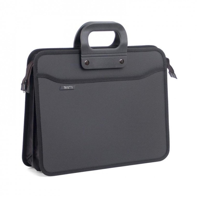 Папка-портфель изготовлена из прочного пластика толщиной 0,9 мм. Габаритные размеры, превышающие стандартные, позволяют свободно размещать внутри папки и документы формата А4+. Имеет четыре отделения. Размеры — 390×320×120 мм. Максимальное расширение портфеля составляет 120 мм. Цвет черный.