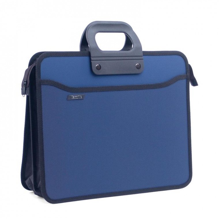 Папка-портфель изготовлена из прочного пластика толщиной 0,9 мм. Габаритные размеры, превышающие стандартные, позволяют свободно размещать внутри папки и документы формата А4+. Имеет четыре отделения. Размеры — 390×320×120 мм. Максимальное расширение портфеля составляет 120 мм. Цвет синий.
