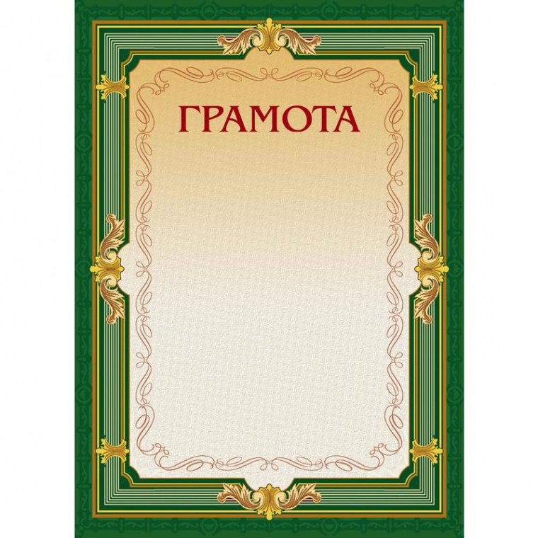 Формат: 210×290 мм. Картон полиграфический мелованный, плотностью 230 г/кв.м. Зеленая рамка , светло-бежевый фон, слово «Грамота» — красная фольга с конгревом (без герба).