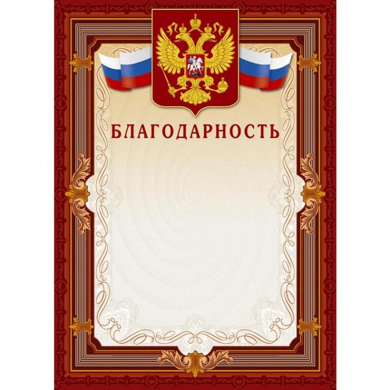 Формат: 210×290 мм. Картон полиграфический мелованный, плотностью 230 г/кв.м. Коричневая рамка, светло-бежевый фон, триколор, герб — золотая фольга с конгревом, слово «Благодарность» — красная фольга с конгревом (без герба).