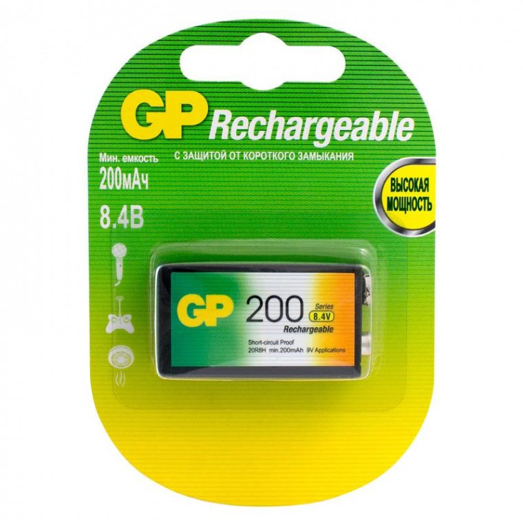 Аккумуляторная батарейка GP Крона 9Vникель-металлогидриднаяNi-Mh, номинальная емкость 200 мАч, время полной зарядки 16 часов, максимальное количество подзарядок 1000. Стабильная работа в широком диапазоне температур (от −20 до +50 С). Отсутствует эффект памяти (нет необходимости разряжать аккумуляторы перед зарядом). Количество аккумуляторов в упаковке — 1 штука.