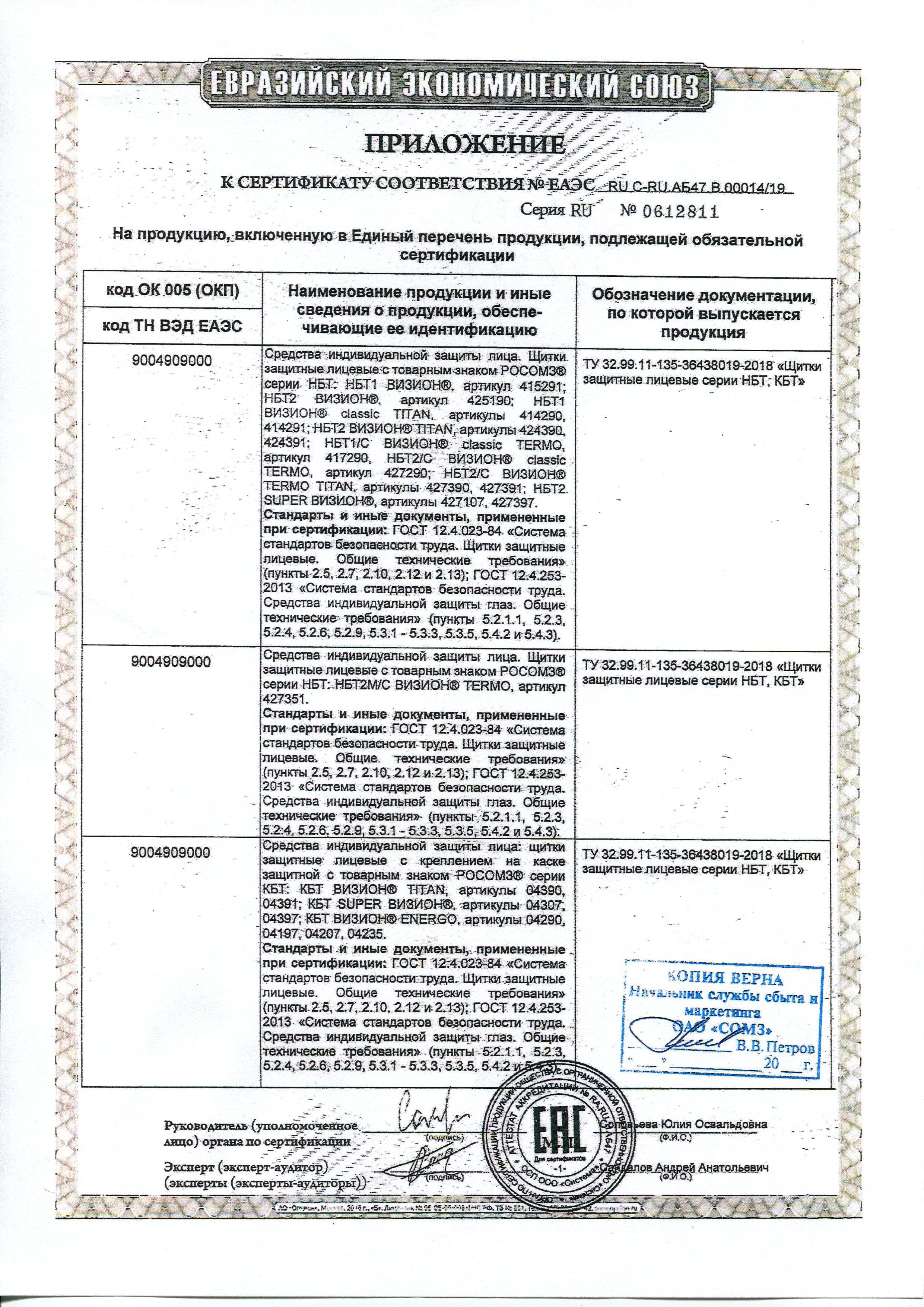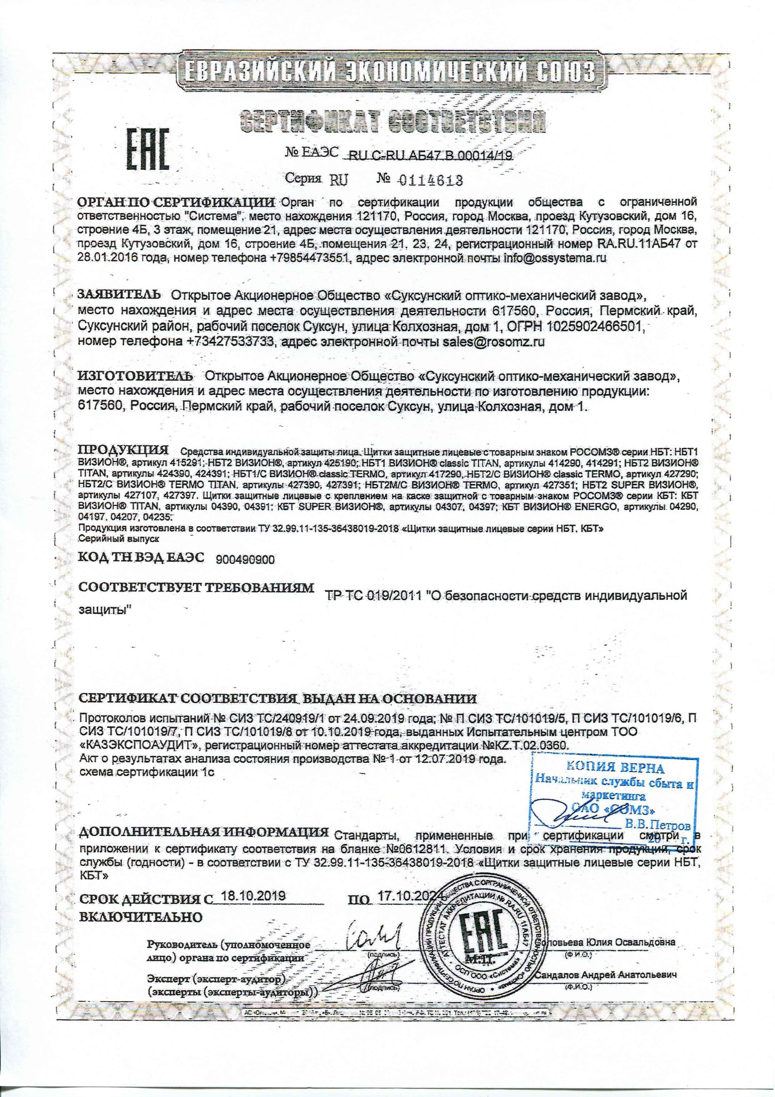 Сертификат на товар - Щиток защитный РОСОМЗ НБТ2 Визион Titan наголовный (424390)