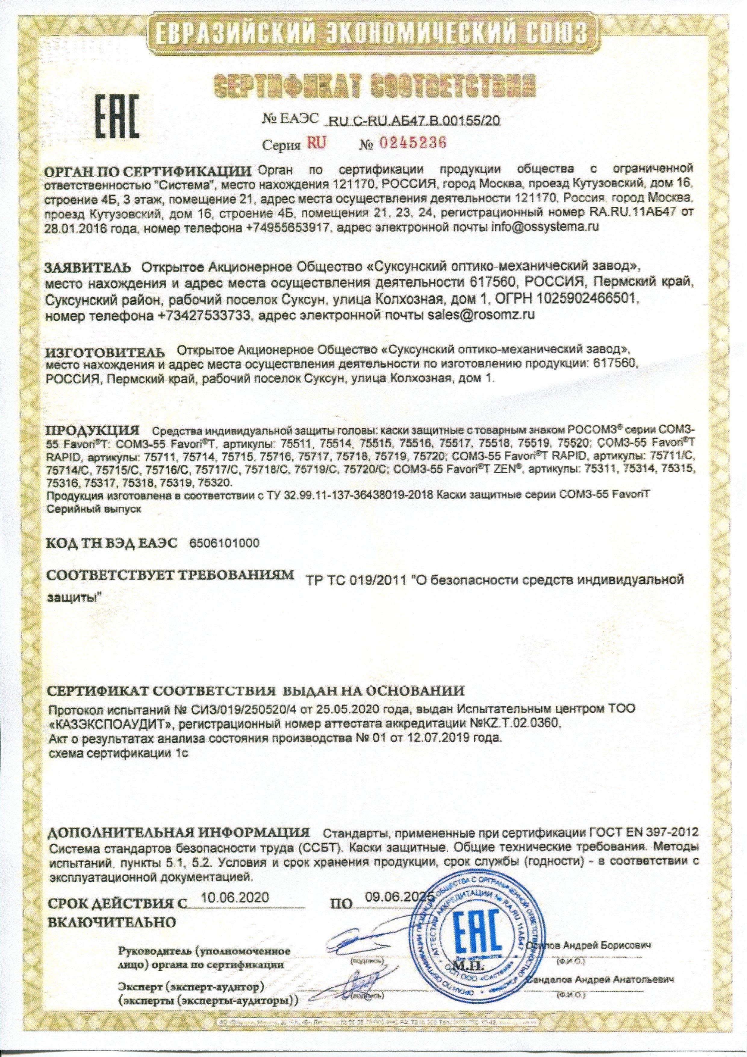 Сертификат на товар - Каска Росомз СОМЗ-55 Favorit Rapid красная (артикул производителя 75716)