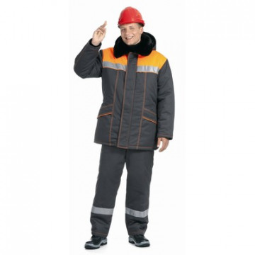 Спецодежда зимняя костюм мужской Билд состоит из куртки и полукомбинезона (размер 60-62, рост 170-176) темно-серого цвета с оранжевыми вставками. Изготовлен из смесовой ткани с водоотталкивающей пропиткой (65% полиэфир, 35% хлопок), плотность ткани - 200 г/кв.м. Утеплитель - синтепон, плотность утеплителя куртки - 150 г/кв.м (3 слоя), полукомбинезона - 150 г/кв.м (2 слоя). Материал подкладки - 100% полиэстер. Светоотражающая полоса размещена на груди, а также внизу полукомбинезона. Куртка с застежкой на двухзамковую молнию и ветрозащитный клапан. Воротник из искусственного меха. Боковые утепленные карманы с клапаном, внутренний карман для документов. Кулиски по линии талии и по низу - дополнительная защита от ветра. Рукава с полушерстяными напульсниками. Отстегивающийся утепленный капюшон. Полукомбинезон с застежкой на двухзамковую молнию, с боковыми накладными карманами, сзади по линии талии стянут эластичной тесьмой. Костюм обеспечивает защиту от пониженных температур и производственных загрязнений. ГОСТ 12. 4. 303-2016.