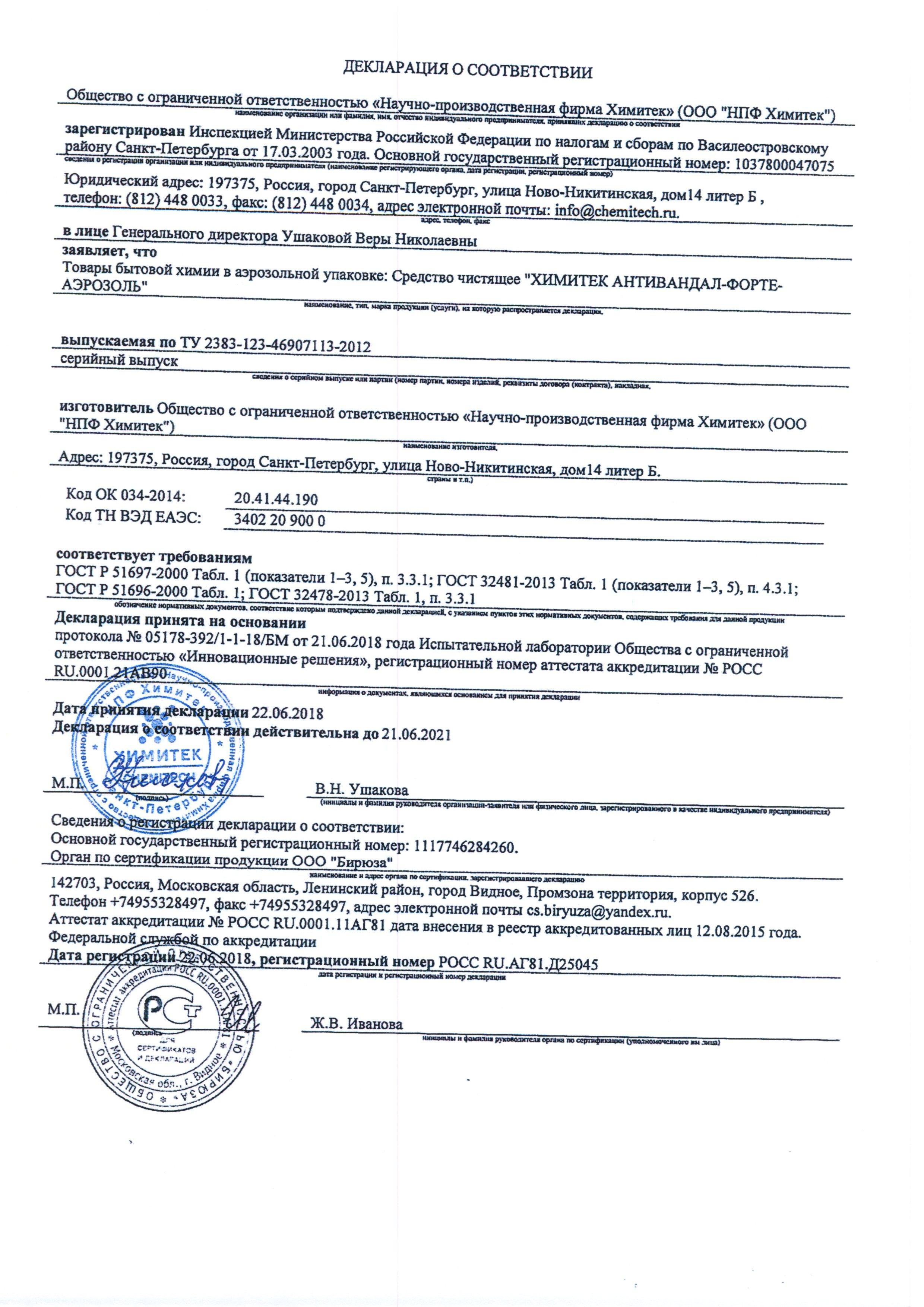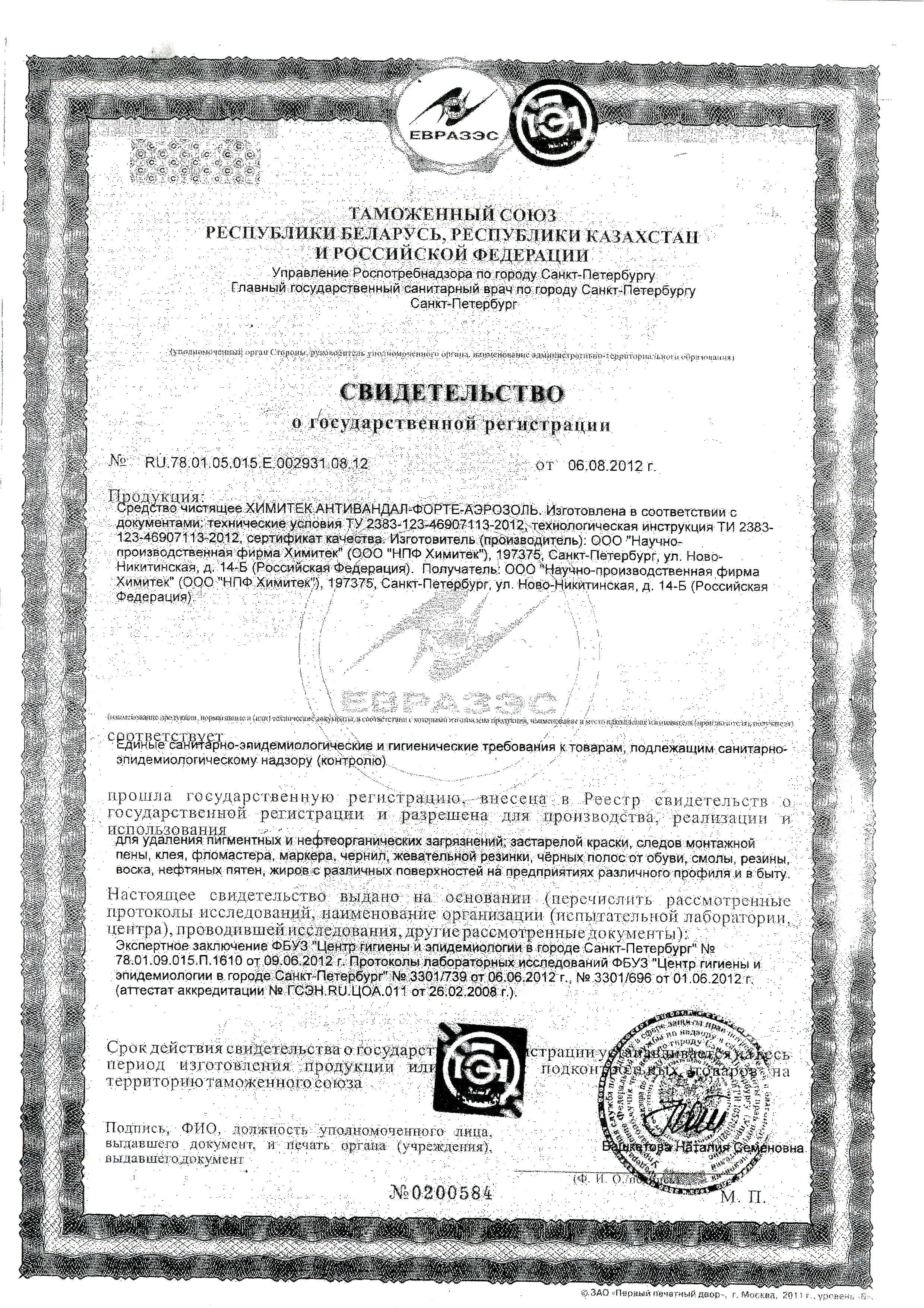 Многоцелевое безводное средство для удаления пигментных и нефтеорганических загрязнений Химитек Антивандал-Форте-Аэрозоль
