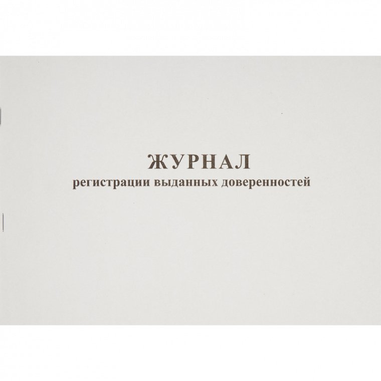 Журнал регистрации выданных доверенностей (формат А4). Обложка изготовлена из картона белого цвета. Внутренний блок — газетная бумага, 48 листов, крепится к обложке с помощью скрепок.