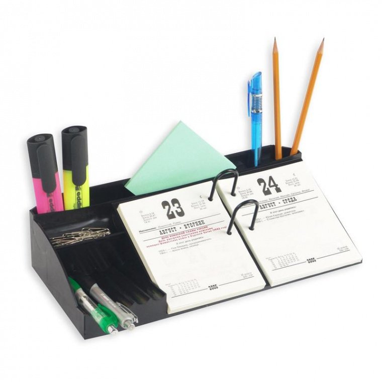 Подставка для перекидных календарей 'Аврора' изготовлена из пластика черного цвета, размер - 380x150x75 мм. Расстояние между дужками 40 мм.Дополнена отсеками для хранения ручек, небольших блокнотов и прочих канцелярских принадлежностей.