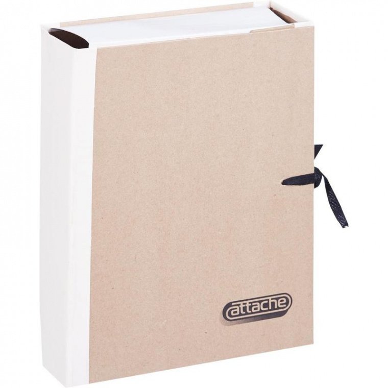 Архивная папка Attache формата А4 выполнена из плотного картона, обтянутого крафт-бумагой. Корешок шириной 50 мм — из коленкора (переплетная хлопчатобумажная ткань). В закрытом виде фиксируется с помощью четырех завязок. Вмещает до 450 листов стандартной плотности. Толщина картона 1,25 мм. Размер изделия — 310×50×230 мм.