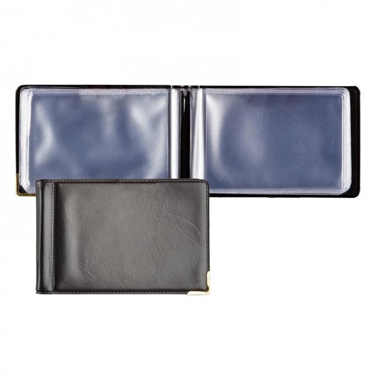 Визитница Koh-I-Noor, выполненная из искусственной кожи черного цвета, имеет 20 листов, в которые можно вложить по 2 карты, что позволяет вместить 40 визиток. Износоустойчивая обложка с металлическими уголками. Размер изделия: 120×70 мм