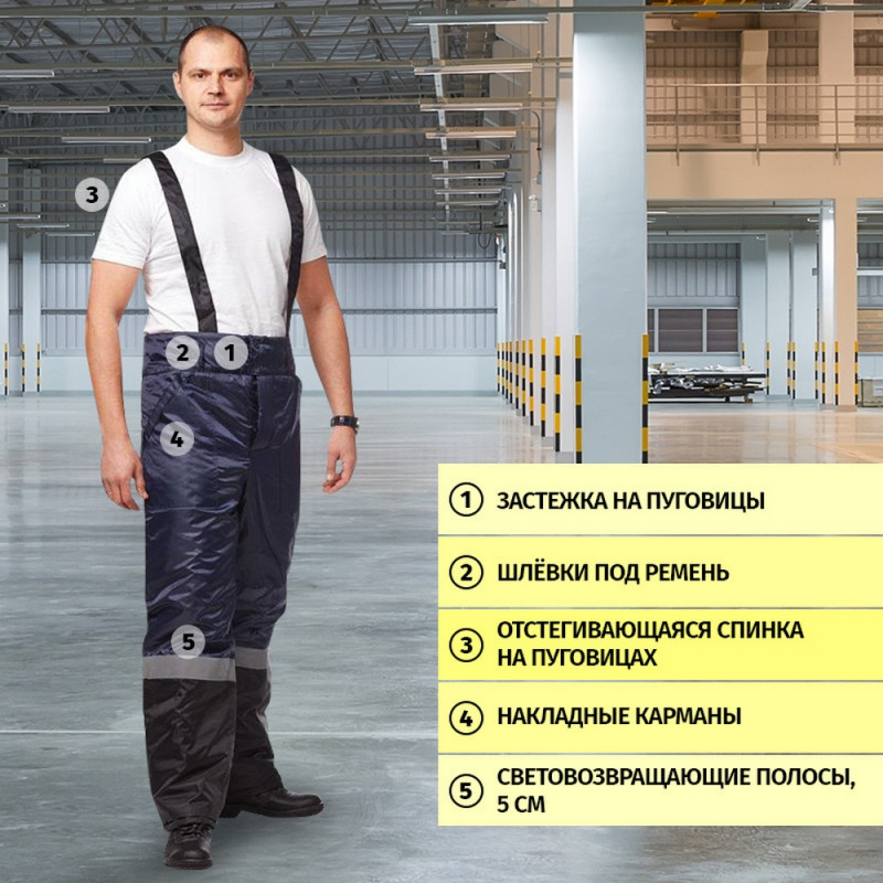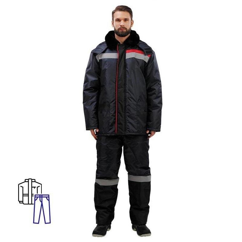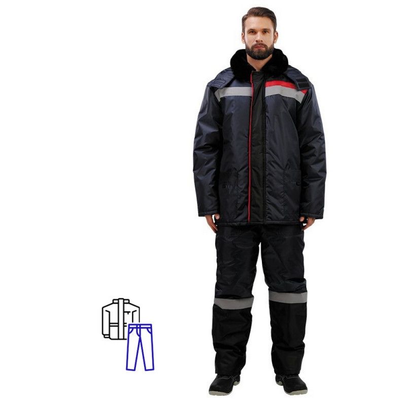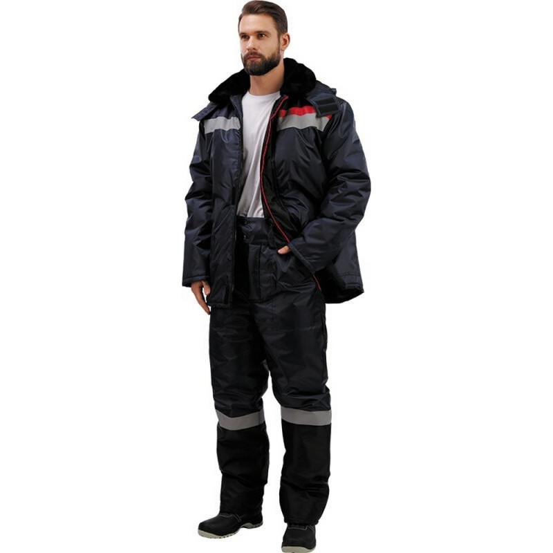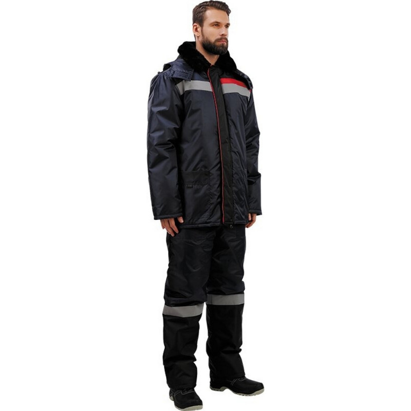 Спецодежда зимняя костюм мужской з02-КБР состоит из куртки и брюк (размер 60-62, рост 182-188) синего цвета с черными и красными вставками. Изготовлен из ткани Оксфорд (100% полиэстер), плотность ткани - 110 г/кв.м. Утеплитель - синтепон, плотность утеплителя куртки - 200 г/кв.м (2 слоя), брюк - 200 г/кв.м (1 слой). Материал подкладки - 100% полиэстер. Светоотражающая полоса размещена на груди, спине, а также внизу брюк. Куртка прямого силуэта с центральной застежкой на молнии. Меховой воротник и капюшон, отстегивающийся при необходимости, хорошо защищают от холода. Внизу рукава есть трикотажные напульсники, которые предотвращают попадание холодного ветра внутрь. Брюки имеют прямой силуэт с высоким поясом и центральной застежкой на пуговицах. Костюм обеспечивает защиту от пониженных температур и производственных загрязнений. ГОСТ 12. 4. 236. 2007.