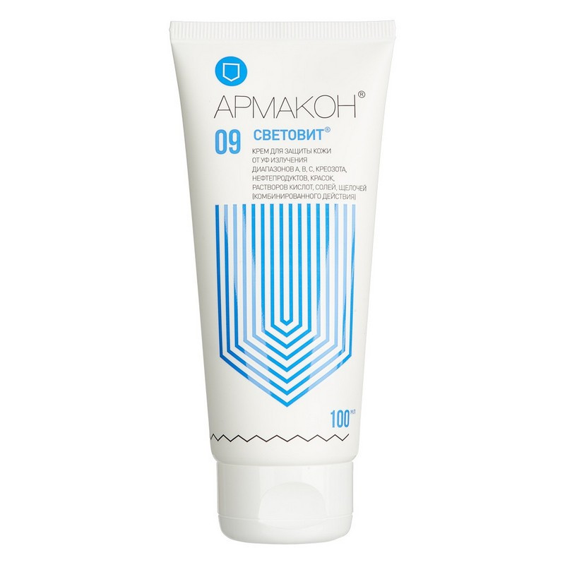 Крем защитный Армакон Световит предназначен для защиты кожи от УФ излучения диапазонов А, В, С, и попеременного воздействия водонерастворимых (креозот, нефтепродукты, растворители, технические масла, краски) и водорастворимых (растворы кислот, солей, щелочей, известь, цемент, удобрения) материалов и веществ. СВЕТОВИТ эффективен для защиты кожи от УФ-излучения как естественной (при работе на открытом воздухе). так и искусственной (при использовании электросварочных и других аппаратов, устройств) природы. Результат достигается благодаря специально подобранному комплексу современных физических и химических УФ-фильтров. Физические фильтры отражают и рассеивают излучение, химические фильтры поглощают солнечное излучение за счет химической структуры. Фактор защиты - SPF 30. Для защиты от водорастворимых и водонерастворимых материалов и веществ в состав добавлены специальные барьерные компоненты, образующие на коже прочную газопроницаемую защитную пленку. СВЕТОВИТ усиливает защитные функции кожи и облегчает последующий процесс очищения от загрязнений. Крем содержит ухаживающие и смягчающие компоненты. Витамин Е (Tocopheryl Acetate) - антиоксидант, увлажняет кожу, стимулирует процесс регенерации тканей, активизирует тканевое дыхание, замедляет процесс формирования свободных радикалов и окисления липидов. Глицерин (Glycerin) обладает способностью аккумулировать влагу из воздуха и насыщать ею кожу. Аллантоин (Allantoin) является эффективным заживляющим средством. Препятствует закупориванию пор, обладает противовоспалительным и антибактериальным действием, противодействует росту бактерий. Водостойкая формула позволяет использовать крем в сложных рабочих условиях. Не содержит силиконов, красителей и парабенов. Тщательно нанести крем на чистую, сухую кожу до начала работы. Соответствует ТР ТС 019.2011/ГОСТ 31460-2012/ГОСТ 31696-2012 Упаковка: туба 100 мл. Условия хранения: избегать попадания прямых солнечных лучей. Срок годности от даты изготовления 24 месяца.Внимание! Произошло изменение дизайна упаковок производителем. В связи с этим изображения товаров на фотографиях, представленных на сайте, могут отличаться. Дизайн упаковки представлен в двух вариантах без возможности выбора.