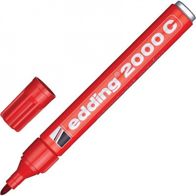 Перманентный маркер Edding E-2000C/2 в металлическом корпусе. Нестираемые свето- и водостойкие чернила на спиртовой основе. Идеально подходит для надписей на металле (в том числе и на грязном), картоне. Может использоваться для таких поверхностей, как дерево (в том числе влажное), стекло, пластик, керамика, кафель, различные пленки. Круглый наконечник маркера позволяет провести линию толщиной от 1,5 до 3 мм. Страна производства — Германия. Цвет — красный.