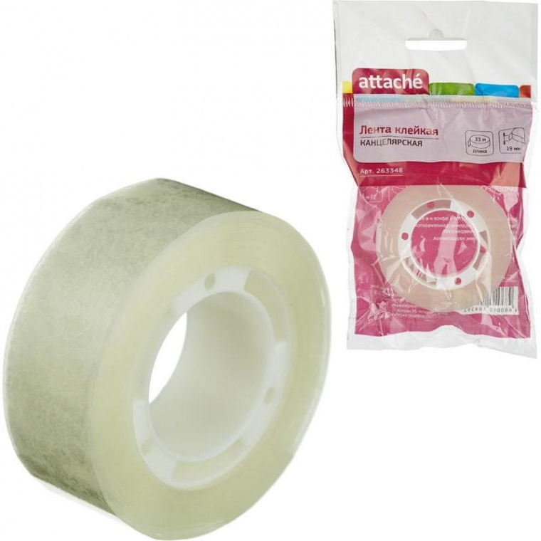 Канцелярская клейкая лента Attache прозрачная используется в офисной, банковской и бытовой сфере. Поставляется в роликах с втулкой. Плотность ленты — 35 мкм. Клейкость ленты — 147 Н/м. Один ролик шириной 19 мм содержит 33 метра клейкой канцелярской ленты. Для производства канцелярских лент используется сырьё с клеем на основе акриловой эмульсии. Ленты с данным клеевым слоем обладают низкой первоначальной клейкостью и требуют времени для полноценного прилипания к поверхности.