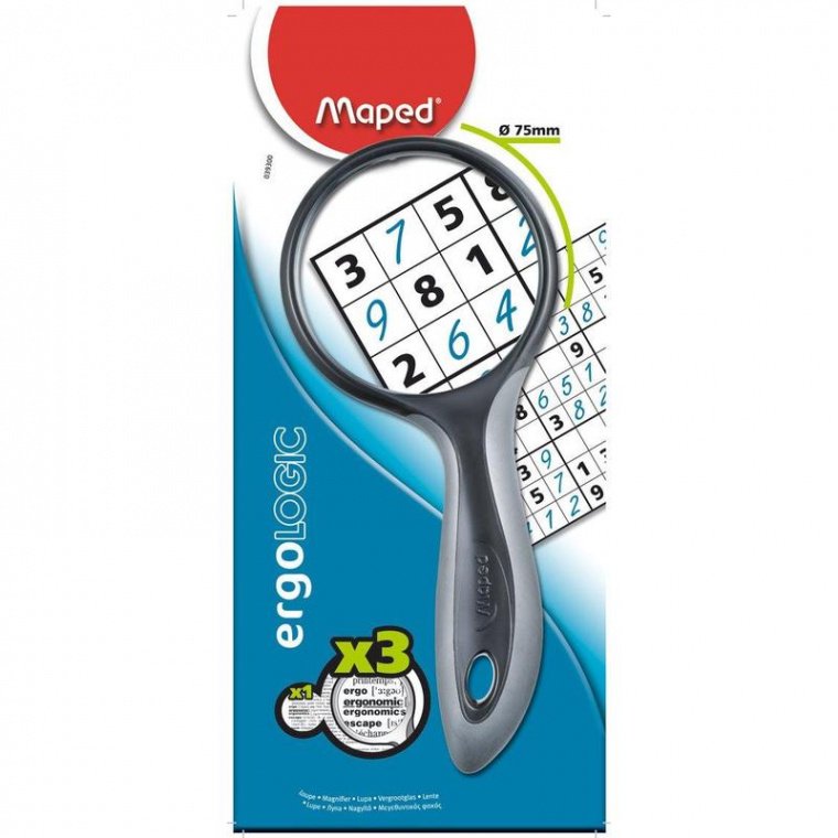 Лупа Maped 039300 изготовлена из недеформирующегося стекла, которое вставлено в корпус из пластика. Ручка лупы имеет резиновое покрытие, что уменьшает скольжение. Отверстие в ручке позволяет вешать лупу для хранения. Диаметр лупы равен 75 мм. Данный прибор позволяет производить трехкратное увеличение.