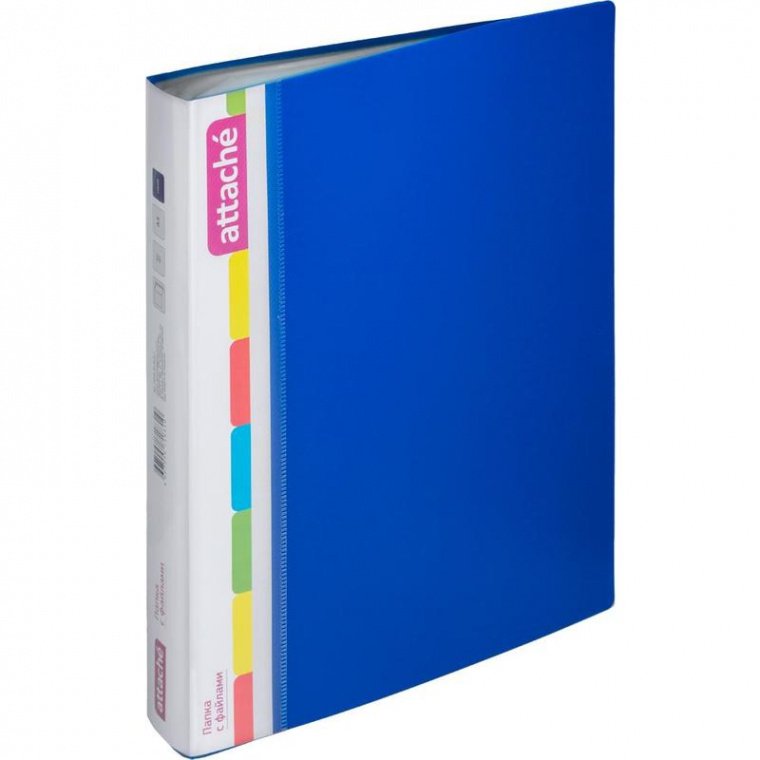Папка с файлами Attache предназначена для хранения материалов и документов формата А4, требующих упорядоченности и наглядного обзора: отчетов, презентаций, коммерческих и персональных портфолио. Ширина корешка составляет 20 мм. Изготовлена из пластика толщиной 0,7 мм синего цвета, имеет 60 прозрачных вкладышей, а также карман на корешке для сменной этикетки. Плотность 30 мкм. Поверхность файлов — гладкая, глянцевая. Вмещает до 120 листов стандартной плотности. Преимуществом файловой папки является надежная сохранность документов в отличном состоянии без предварительной перфорации. Плотность файлов 25 мкм.